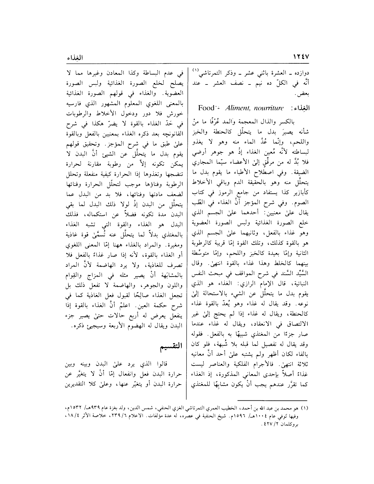 بالكسر والذال المعجمة والمد عرفا ما من شأنه يصير بدل ما يتحلّل كالحنطة والخبز واللحم، وإنّما عدّ الماء منه وهو لا يغذو لبساطته لأنّه معين الغذاء إذ هو جوهر أرضي فلا بدّ له من مرقّق إلى الأعضاء سيّما المجاري الضيقة. وفي اصطلاح الأطباء ما يقوم بدل ما يتحلّل منه وهو بالحقيقة الدم وباقي الأخلاط كأبازير كذا يستفاد من جامع الرموز في كتاب الصوم. وفي شرح المؤجز أنّ الغذاء في الطّب يقال على معنيين: أحدهما على الجسم الذي خلع الصورة الغذائية ولبس الصورة العضوية وهو غذاء بالفعل، وثانيهما على الجسم الذي هو بالقوة كذلك، وتلك القوة إمّا قريبة كالرطوبة الثانية وإمّا بعيدة كالخبز واللحم، وإمّا متوسّطة بينهما كالخلط وهذا غذاء بالقوة انتهى. وقال السّيّد السّند في شرح المواقف في مبحث النفس النباتية، قال الإمام الرازي: الغذاء هو الذي يقوم بدل ما يتحلّل عن الشيء بالاستحالة إلى نوعه. وقد يقال له غذاء وهو يعدّ بالقوة غذاء كالحنطة، ويقال له غذاء إذا لم يحتج إلى غير الالتصاق في الانعقاد، ويقال له غذاء عند ما صار جزءا من المغتذي شبيها به بالفعل. فقوله وقد يقال له تفصيل لما قبله بلا شبهة، فلو كان بالفاء لكان أظهر ولم يشتبه على أحد أنّ معانيه ثلاثة انتهى. فالأجرام الفلكية والعناصر ليست غذاء أصلا بإحدى المعاني المذكورة، إذ الغذاء كما تقرّر عندهم يجب أن يكون مشابها للمغتذي في عدم البساطة وكذا المعادن وغيرها مما لا يصلح لخلع الصورة الغذائية ولبس الصورة العضوية. والغذاء في قولهم الصورة الغذائية بالمعنى اللغوي المعلوم المشهور الذي فارسيه خورش فلا دور ودخول الأخلاط والرطوبات في حدّ الغذاء بالقوة لا يضرّ هكذا في شرح القانونچهـ بعد ذكره الغذاء بمعنيين بالفعل وبالقوة على طبق ما في شرح المؤجز. وتحقيق قولهم يقوم بدل ما يتحلّل عن الشيء أنّ البدن لا يمكن تكونه إلّا من رطوبة مقارنة لحرارة تنضجها وتغذوها إذا الحرارة كيفية منفعلة وتحلل الرطوبة وفناؤها موجب لتحلّل الحرارة وفنائها لضعف مادتها وفنائها، فلا بد من البدل عما يتحلّل من البدن إذ لولا ذلك البدن لما بقي البدن مدة تكونه فضلا عن استكماله، فذلك البدل هو الغذاء والقوة التي تشبه الغذاء بالمغتذي بدلا لما يتحلّل عنه تسمّى قوة غاذية ومغيرة. والمراد بالغذاء هاهنا إمّا المعنى اللغوي أو الغذاء بالقوة، لأنه إذا صار غذاء بالفعل فلا تصرف للغاذية، ولا يرد الهاضمة لأنّ المراد بالمشابهة أن يصير مثله في المزاج والقوام واللون والجوهر، والهاضمة لا تفعل ذلك بل تجعل الغذاء صالحا لقبول فعل الغاذية كما في شرح حكمة العين. اعلم أنّ الغذاء بالقوة إذا ينفعل يعرض له أربع حالات حتى يصير جزء البدن ويقال له الهضوم الأربعة وسيجيء ذكره.