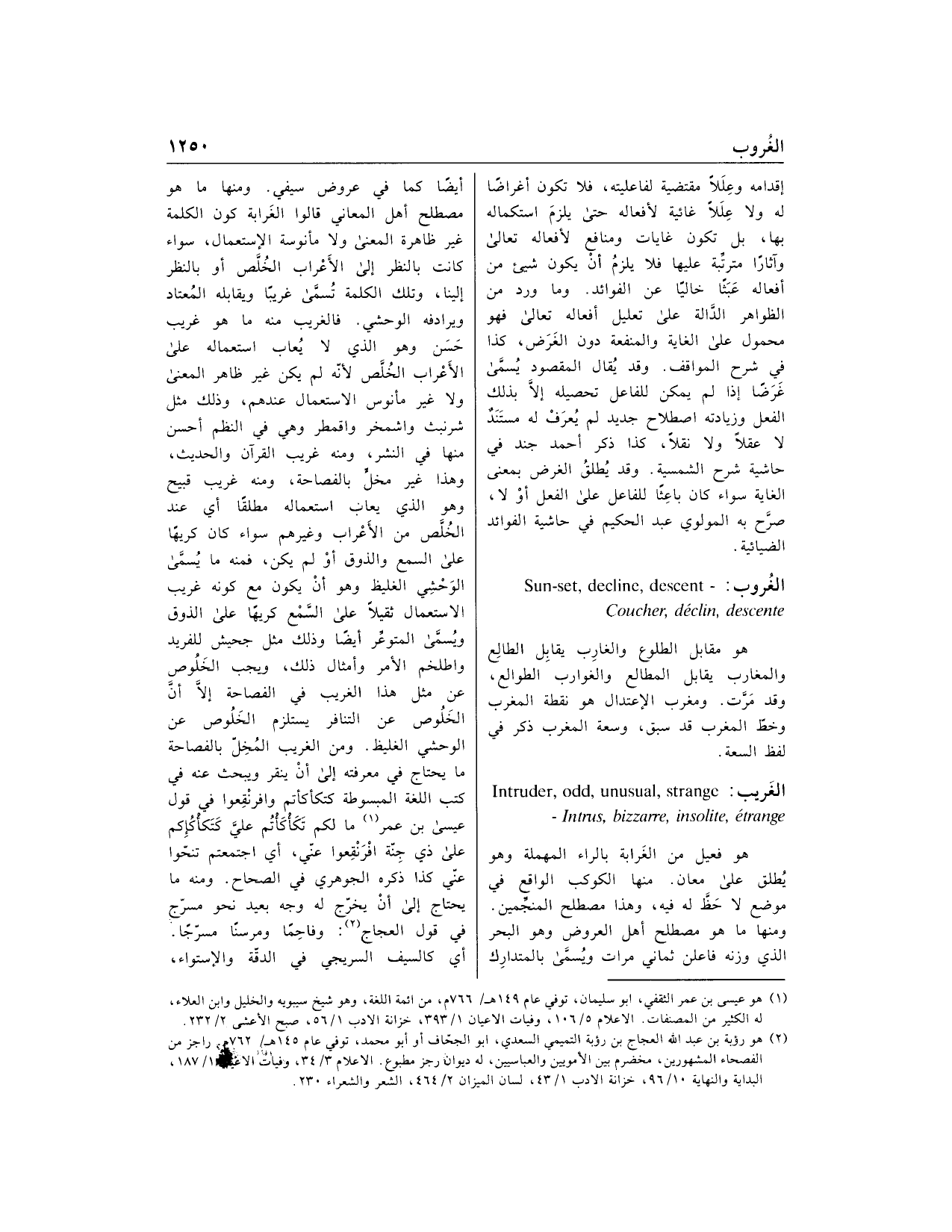 ومنها ما هو مصطلح أهل العروض وهو البحر الذي وزنه فاعلن ثماني مرات ويسمّى بالمتدارك أيضا كما في عروض سيفي. ومنها ما هو مصطلح أهل المعاني قالوا الغرابة كون الكلمة غير ظاهرة المعنى ولا مأنوسة الاستعمال، سواء كانت بالنظر إلى الأعراب الخلّص أو بالنظر إلينا، وتلك الكلمة تسمّى غريبا ويقابله المعتاد ويرادفه الوحشي. فالغريب منه ما هو غريب حسن وهو الذي لا يعاب استعماله على الأعراب الخلّص لأنّه لم يكن غير ظاهر المعنى ولا غير مأنوس الاستعمال عندهم، وذلك مثل شرنبث واشمخر واقمطر وهي في النظم أحسن منها في النشر، ومنه غريب القرآن والحديث، وهذا غير مخلّ بالفصاحة، ومنه غريب قبيح وهو الذي يعاب استعماله مطلقا أي عند الخلّص من الأعراب وغيرهم سواء كان كريها على السمع والذوق أو لم يكن، فمنه ما يسمّى الوحشي الغليظ وهو أن يكون مع كونه غريب الاستعمال ثقيلا على السّمع كريها على الذوق ويسمّى المتوعّر أيضا وذلك مثل جحيش للفريد واطلخم الأمر وأمثال ذلك، ويجب الخلوص عن مثل هذا الغريب في الفصاحة إلّا أنّ الخلوص عن التنافر يستلزم الخلوص عن الوحشي الغليظ. ومن الغريب المخلّ بالفصاحة ما يحتاج في معرفته إلى أن ينقر ويبحث عنه في كتب اللغة المبسوطة كتكأكأتم وافرنقعوا في قول عيسى بن عمر «1» ما لكم تكأكأتم عليّ كتكأكئكم على ذي جنّة افرنقعوا عنّي، أي اجتمعتم تنحّوا عنّي كذا ذكره الجواهري في الصحاح. ومنه ما يحتاج إلى أن يخرّج له وجه بعيد نحو مسرّج في قول العجاج «2»: وفاحما ومرسنا مسرّجا.