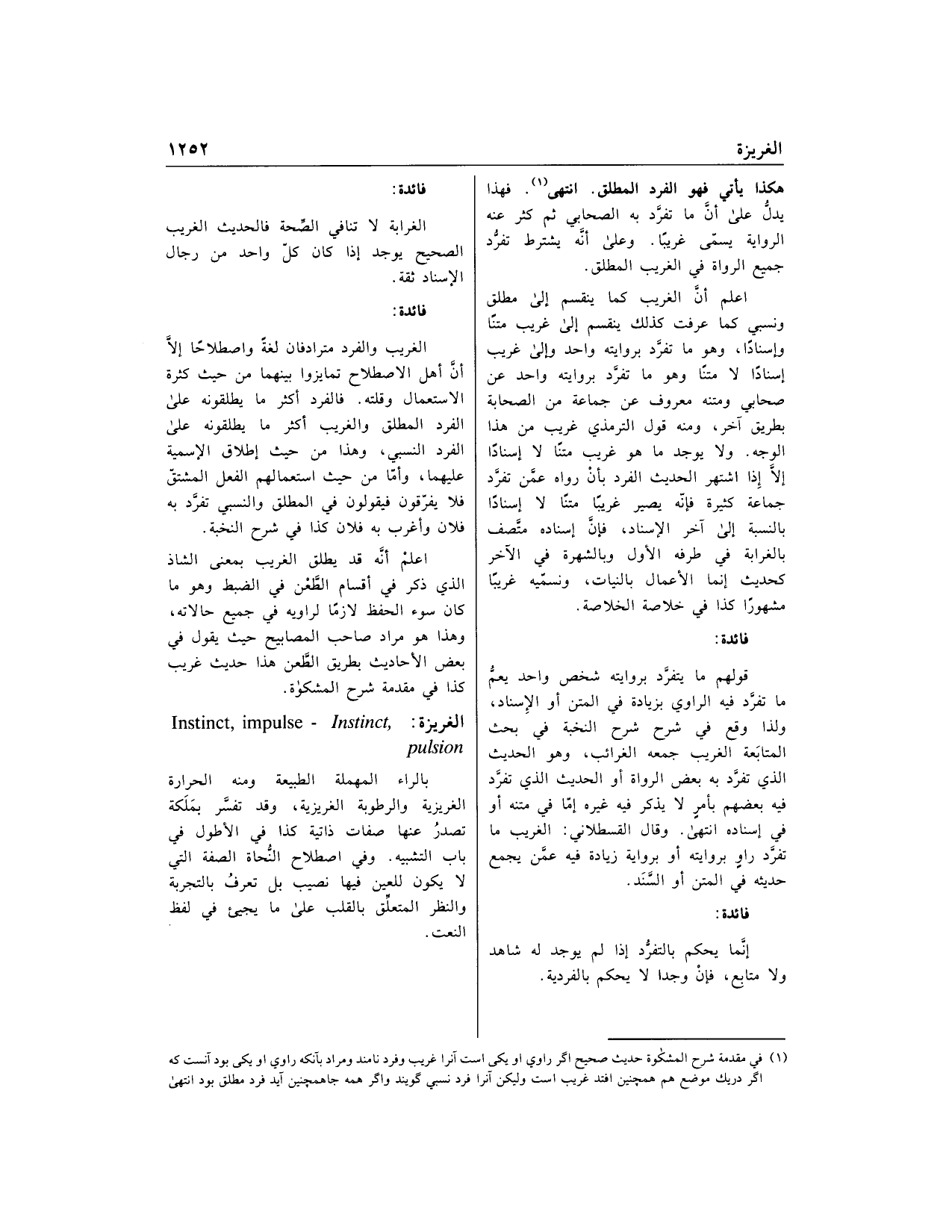 (1) في مقدمة شرح المشكاة حديث صحيح اگر راوي او يكى است آن را غريب وفرد نامند ومراد به آنكه راوي او يكى بود آنست كه اگر در يك موضع هم همچنين افتد غريب است وليكن آن را فرد نسبي گويند واگر همه جا همچنين آيد فرد مطلق بود انتهى