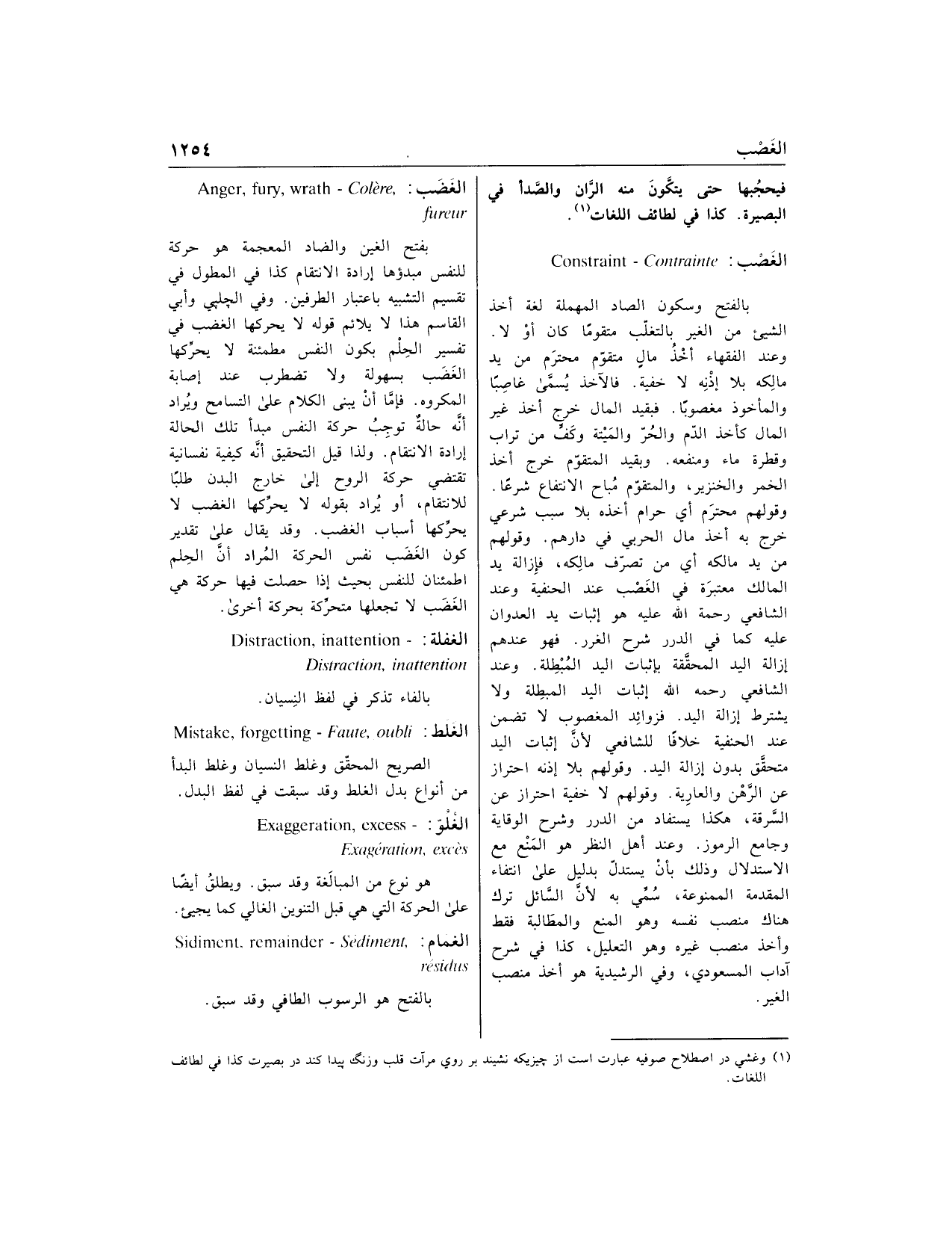 بفتح الغين والضاد المعجمة هو حركة للنفس مبدؤها إرادة الانتقام كذا في المطول في تقسيم التشبيه باعتبار الطرفين. وفي الچلپي وأبي القاسم هذا لا يلائم قوله لا يحركها الغضب في تفسير الحلم بكون النفس مطمئنة لا يحرّكها الغضب بسهولة ولا تضطرب عند إصابة المكروه. فإمّا أن يبنى الكلام على التسامح ويراد أنّه حالة توجب حركة النفس مبدأ تلك الحالة إرادة الانتقام. ولذا قيل التحقيق أنّه كيفية نفسانية تقتضي حركة الروح إلى خارج البدن طلبا للانتقام، أو يراد بقوله لا يحرّكها الغضب لا يحرّكها أسباب الغضب. وقد يقال على تقدير كون الغضب نفس الحركة المراد أنّ الحلم اطمئنان للنفس بحيث إذا حصلت فيها حركة هي الغضب لا تجعلها متحرّكة بحركة أخرى.