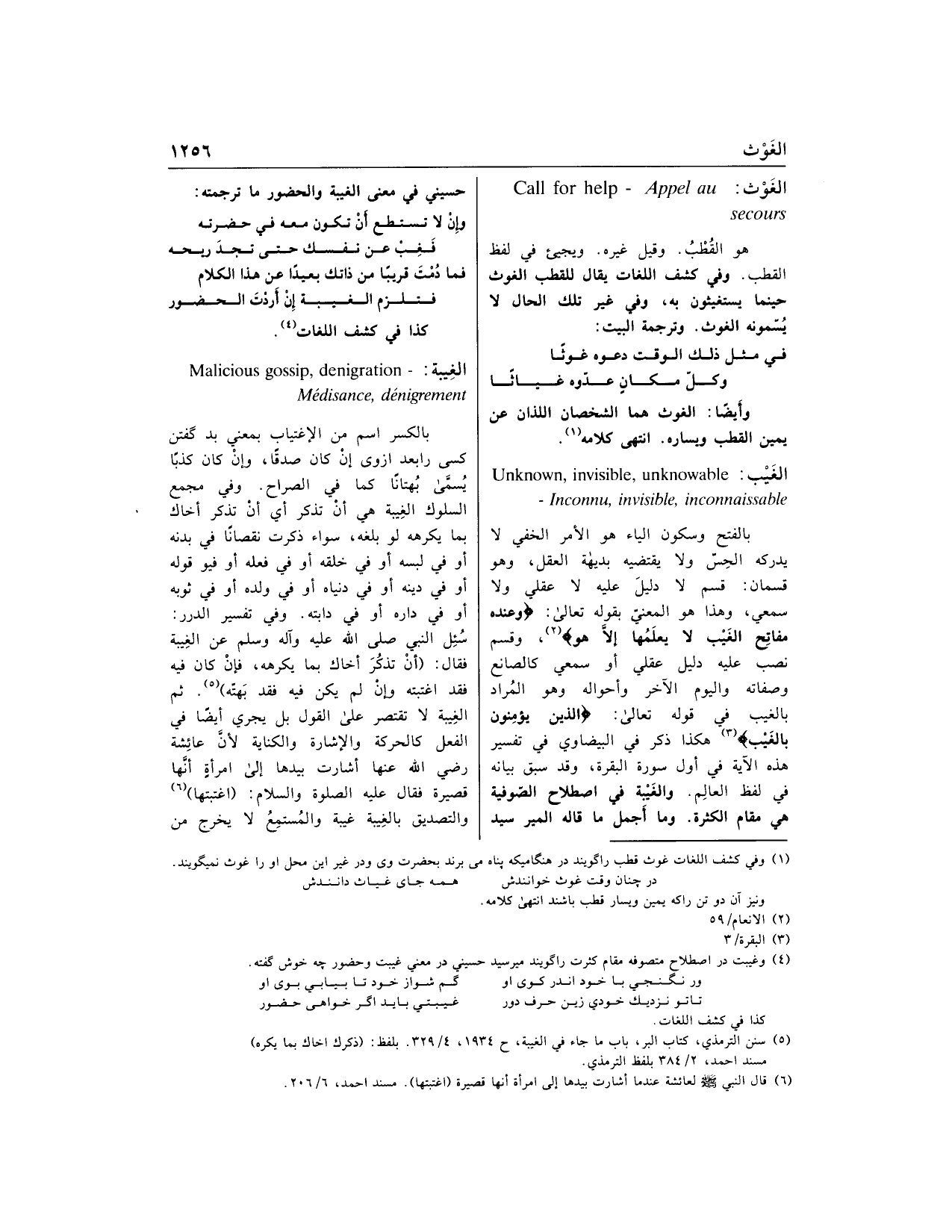 (1) وفي كشف اللغات غوث قطب را گويند در هنگامى كه پناه مى برند بحضرت وى ودر غير اين محل او را غوث نمى گويند.