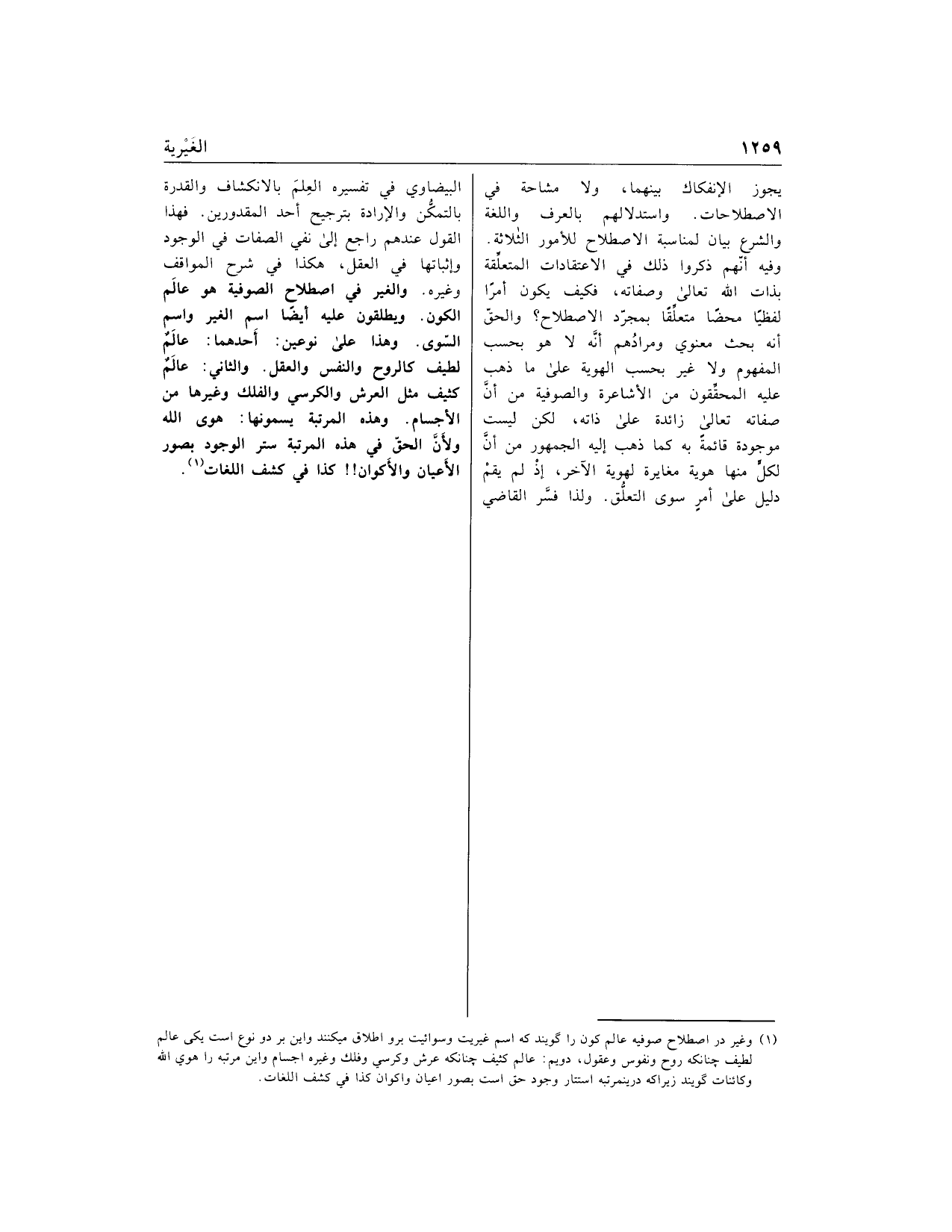 وفيه أنّهم ذكروا ذلك في الاعتقادات المتعلّقة بذات الله تعالى وصفاته، فكيف يكون أمرا لفظيا محضا متعلّقا بمجرّد الاصطلاح؟ والحقّ أنه بحث معنوي ومرادهم أنّه لا هو بحسب المفهوم ولا غير بحسب الهوية على ما ذهب عليه المحقّقون من الأشاعرة والصوفية من أنّ صفاته تعالى زائدة على ذاته، لكن ليست موجودة قائمة به كما ذهب إليه الجمهور من أنّ لكلّ منها هوية مغايرة لهوية الآخر، إذ لم يقم دليل على أمر سوى التعلّق. ولذا فسّر القاضي البيضاوي في تفسيره العلم بالانكشاف والقدرة بالتمكّن والإرادة بترجيح أحد المقدورين. فهذا القول عندهم راجع إلى نفي الصفات في الوجود وإثباتها في العقل، هكذا في شرح المواقف وغيره. والغير في اصطلاح الصوفية هو عالم الكون. ويطلقون عليه أيضا اسم الغير واسم السّوى. وهذا على نوعين: أحدهما: عالم لطيف كالروح والنفس والعقل. والثاني: عالم كثيف مثل العرش والكرسي والفلك وغيرها من الأجسام. وهذه المرتبة يسمونها: هوى الله ولأنّ الحقّ في هذه المرتبة ستر الوجود بصور الأعيان والأكوان!! كذا في كشف اللغات «1».