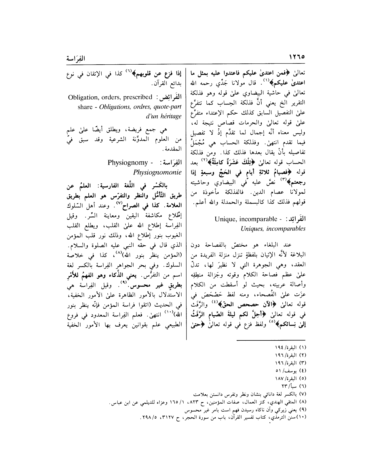 بالكسر في اللّغة الفارسية: العلم عن طريق التّأمّل والنظر والتفرّس هو العلم بطريق العلامة. كذا في الصراح «7». وعند أهل السّلوك اطّلاع مكاشفة اليقين ومعاينة السّر. وقيل الفراسة اطلاع الله على القلب، ويطلع القلب الغيوب بنور اطلاع الله، وذلك نور قلب المؤمن الذي قال في حقه النبي عليه الصلاة والسلام.