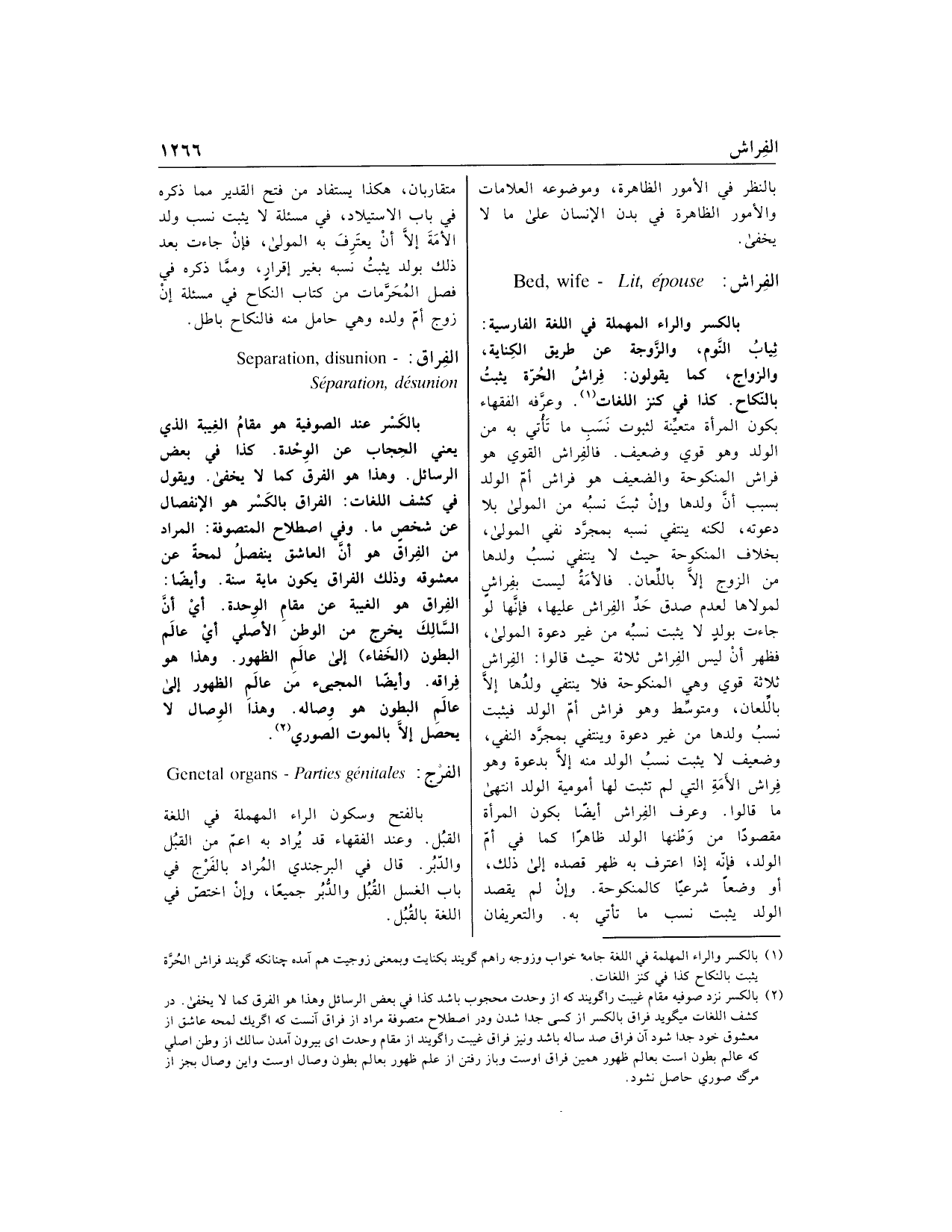 ثياب النّوم، والزّوجة عن طريق الكناية، والزواج، كما يقولون: فراش الحرّة يثبت بالنّكاح. كذا في كنز اللغات «1». وعرّفه الفقهاء بكون المرأة متعيّنة لثبوت نسب ما تأتي به من الولد وهو قوي وضعيف. فالفراش القوي هو فراش المنكوحة والضعيف هو فراش أمّ الولد بسبب أنّ ولدها وإن ثبت نسبة من المولى بلا دعوته، لكنه ينتفي نسبه بمجرّد نفي المولى، بخلاف المنكوحة حيث لا ينتفي نسب ولدها من الزوج إلّا باللّعان. فالأمة ليست بفراش لمولاها لعدم صدق حدّ الفراش عليها، فإنّها لو جاءت بولد لا يثبت نسبه من غير دعوة المولى، فظهر أن ليس الفراش ثلاثة حيث قالوا: الفراش ثلاثة قوي وهي المنكوحة فلا ينتفي ولدها إلّا باللّعان، ومتوسّط وهو فراش أمّ الولد فيثبت نسب ولدها من غير دعوة وينتفي بمجرّد النفي، وضعيف لا يثبت نسب الولد منه إلّا بدعوة وهو فراش الأمة التي لم تثبت لها أمومية الولد انتهى ما قالوا. وعرف الفراش أيضا بكون المرأة مقصودا من وطئها الولد ظاهرا كما في أمّ الولد، فإنّه إذا اعترف به ظهر قصده إلى ذلك، أو وضعا شرعيا كالمنكوحة. وإن لم يقصد الولد يثبت نسب ما تأتي به. والتعريفان متقاربان، هكذا يستفاد من فتح القدير مما ذكره في باب الاستيلاد، في مسئلة لا يثبت نسب ولد الأمة إلّا أن يعترف به المولى، فإن جاءت بعد ذلك بولد يثبت نسبه بغير إقرار، وممّا ذكره في فصل المحرّمات من كتاب النكاح في مسئلة إن زوج أمّ ولده وهي حامل منه فالنكاح باطل.
