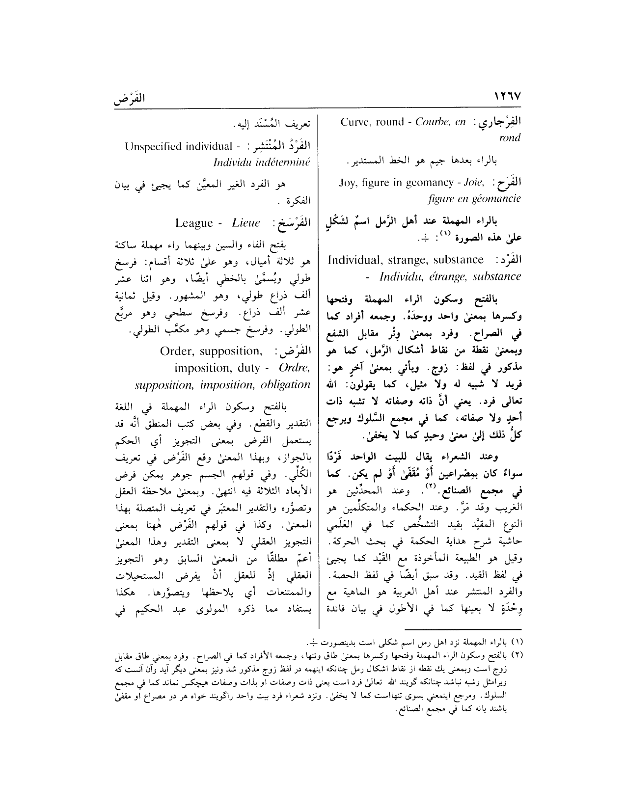 بالفتح وسكون الراء المهملة في اللغة التقدير والقطع. وفي بعض كتب المنطق أنّه قد يستعمل الفرض بمعنى التجويز أي الحكم بالجواز، وبهذا المعنى وقع الفرض في تعريف الكلّي. وفي قولهم الجسم جوهر يمكن فرض الأبعاد الثلاثة فيه انتهى. وبمعنى ملاحظة العقل وتصوّره والتقدير المعتبر في تعريف المتصلة بهذا المعنى. وكذا في قولهم الفرض هاهنا بمعنى التجويز العقلي لا بمعنى التقدير وهذا المعنى أعمّ مطلقا من المعنى السابق وهو التجويز العقلي إذ للعقل أن يفرض المستحيلات والممتنعات أي يلاحظها ويتصوّرها. هكذا يستفاد مما ذكره المولوى عبد الحكيم في