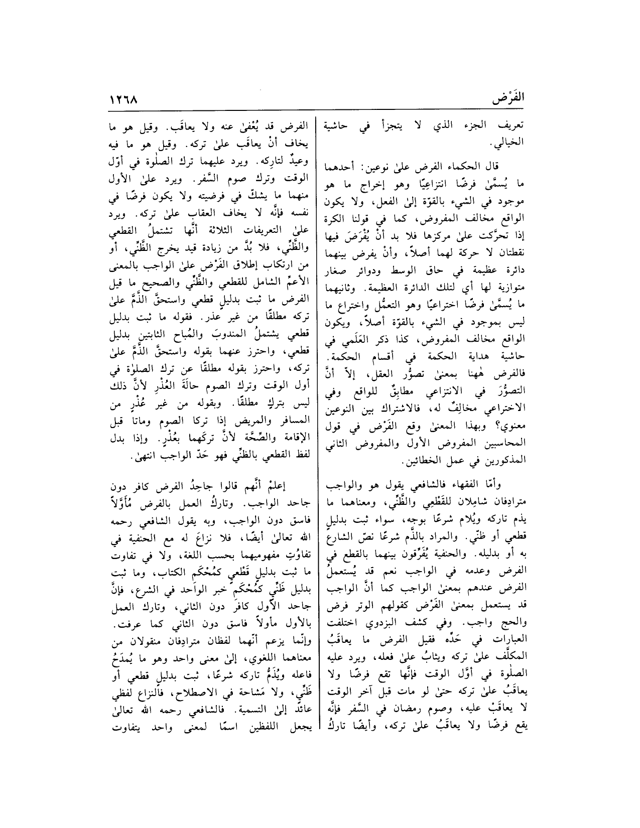 وأمّا الفقهاء فالشافعي يقول هو والواجب مترادفان شاملان للقطعي والظّنّي، ومعناهما ما يذم تاركه ويلام شرعا بوجه، سواء ثبت بدليل قطعي أو ظنّي. والمراد بالذّم شرعا نصّ الشارع به أو بدليله. والحنفية يفرّقون بينهما بالقطع في الفرض وعدمه في الواجب نعم قد يستعمل الفرض عندهم بمعنى الواجب كما أنّ الواجب قد يستعمل بمعنى الفرض كقولهم الوتر فرض والحج واجب. وفي كشف البزدوي اختلفت العبارات في حدّه فقيل الفرض ما يعاقب المكلّف على تركه ويثاب على فعله، ويرد عليه الصلاة في أوّل الوقت فإنّها تقع فرضا ولا يعاقب على تركه حتى لو مات قبل آخر الوقت لا يعاقب عليه، وصوم رمضان في السّفر فإنّه يقع فرضا ولا يعاقب على تركه، وأيضا تارك الفرض قد يعفى عنه ولا يعاقب. وقيل هو ما يخاف أن يعاقب على تركه. وقيل هو ما فيه وعيد لتاركه. ويرد عليهما ترك الصلاة في أوّل الوقت وترك صوم السّفر. ويرد على الأول منهما ما يشكّ في فرضيته ولا يكون فرضا في نفسه فإنّه لا يخاف العقاب على تركه. ويرد على التعريفات الثلاثة أنّها تشتمل القطعي والظّنّي، فلا بدّ من زيادة قيد يخرج الظّنّي، أو من ارتكاب إطلاق الفرض على الواجب بالمعنى الأعمّ الشامل للقطعي والظّنّي والصحيح ما قيل الفرض ما ثبت بدليل قطعي واستحقّ الذّمّ على تركه مطلقا من غير عذر. فقوله ما ثبت بدليل قطعي يشتمل المندوب والمباح الثابتين بدليل قطعي، واحترز عنهما بقوله واستحقّ الذّمّ على تركه، واحترز بقوله مطلقا عن ترك الصلاة في أول الوقت وترك الصوم حالة العذر لأنّ ذلك ليس بترك مطلقا. وبقوله من غير عذر من المسافر والمريض إذا تركا الصوم وماتا قبل الإقامة والصّحّة لأنّ تركهما بعذر. وإذا بدل لفظ القطعي بالظنّي فهو حدّ الواجب انتهى.