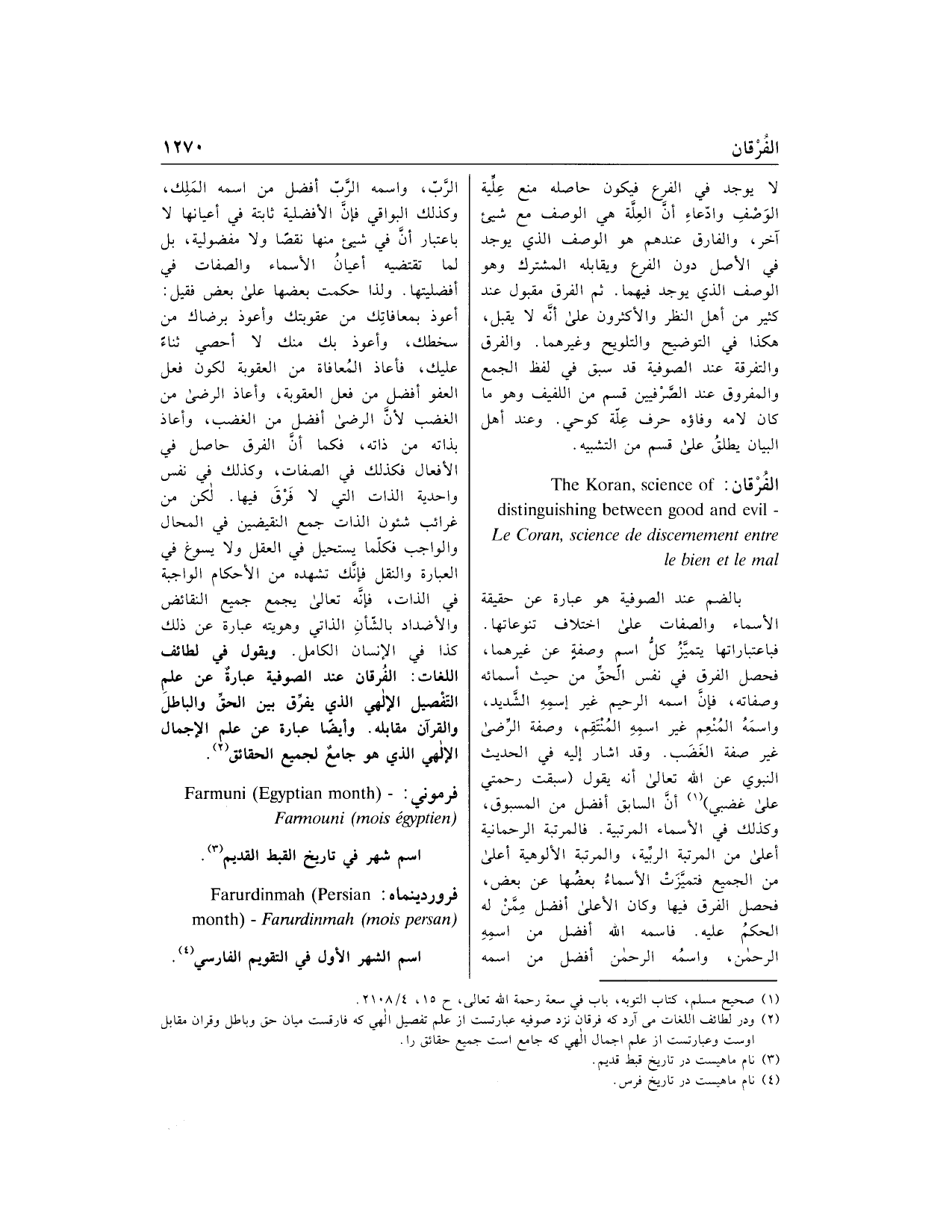 (2) ودر لطائف اللغات مىرد كه فرقان نزد صوفيه عبارتست از علم تفصيل إلهي كه فارقست ميان حق وباطل وقران مقابل اوست وعبارتست از علم اجمال إلهي كه جامع است جميع حقائق را.