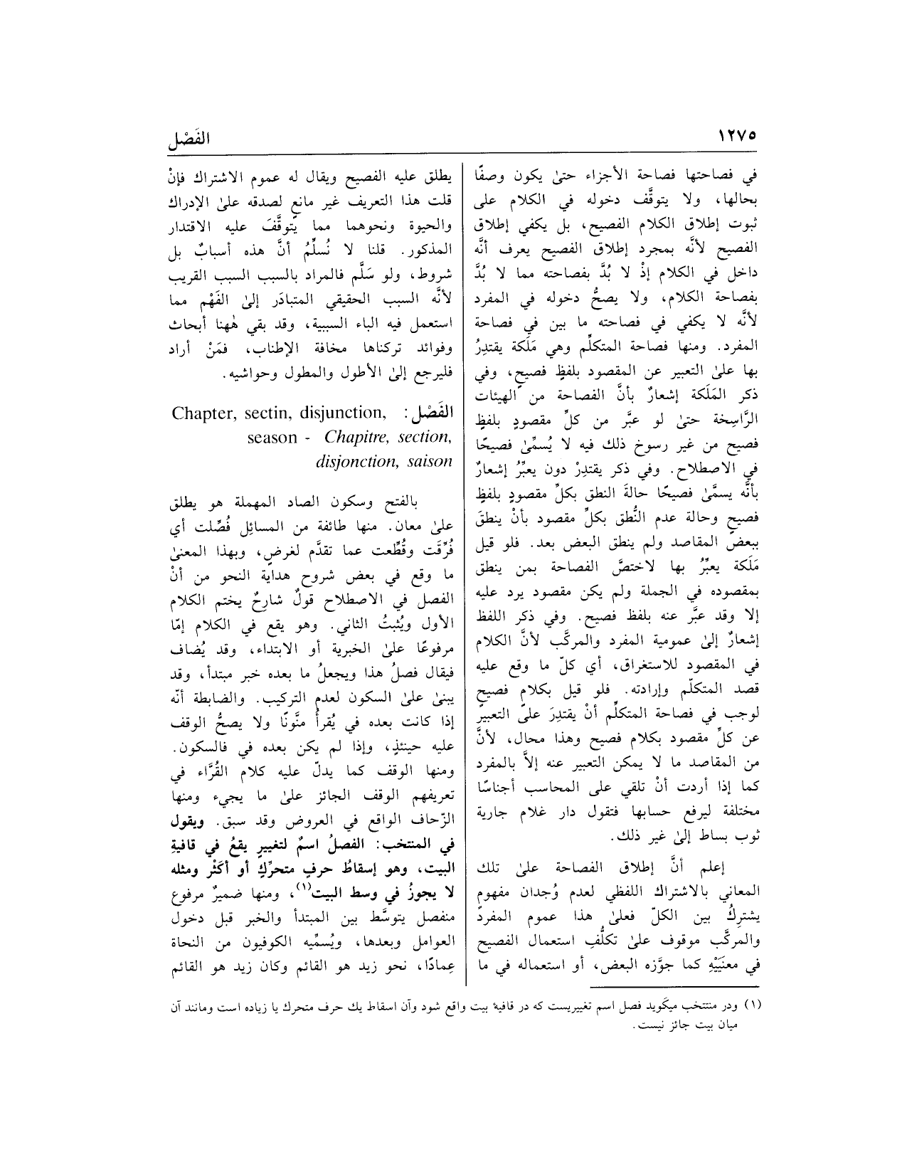 بالفتح وسكون الصاد المهملة هو يطلق على معان. منها طائفة من المسائل فصّلت أي فرّقت وقطّعت عما تقدّم لغرض، وبهذا المعنى ما وقع في بعض شروح هداية النحو من أن الفصل في الاصطلاح قول شارح يختم الكلام الأول ويثبت الثاني. وهو يقع في الكلام إمّا مرفوعا على الخبرية أو الابتداء، وقد يضاف فيقال فصل هذا ويجعل ما بعده خبر مبتدأ، وقد يبنى على السكون لعدم التركيب. والضابطة أنّه إذا كانت بعده في يقرأ منّونا ولا يصحّ الوقف عليه حينئذ، وإذا لم يكن بعده في فالسكون.