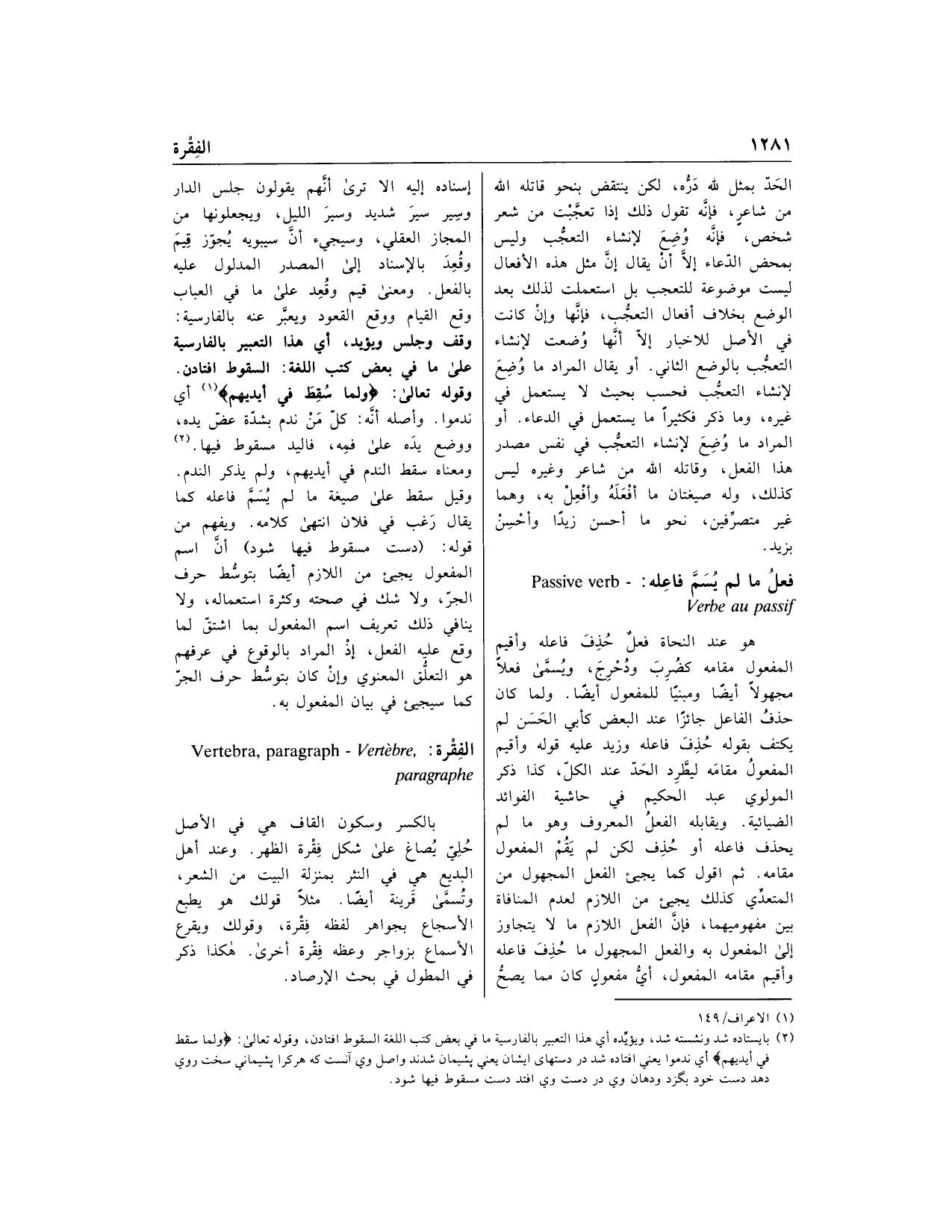 وقيل سقط على صيغة ما لم يسمّ فاعله كما يقال رغب في فلان انتهى كلامه. ويفهم من قوله: (دست مسقوط فيها شود) أنّ اسم المفعول يجيء من اللازم أيضا بتوسّط حرف الجرّ، ولا شك في صحته وكثرة استعماله، ولا ينافي ذلك تعريف اسم المفعول بما اشتقّ لما وقع عليه الفعل، إذ المراد بالوقوع في عرفهم هو التعلّق المعنوي وإن كان بتوسّط حرف الجرّ كما سيجيء في بيان المفعول به.