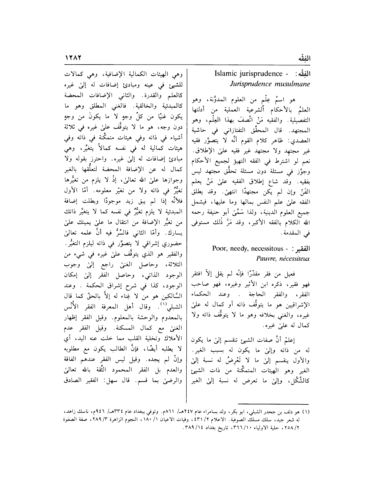 والفقير هو الذي يتوقّف على غيره في شيء من الثلاثة، وحاصل الغنى راجع إلى وجوب الوجود الذاتي، وحاصل الفقر إلى إمكان الوجود، كذا في شرح إشراق الحكمة. وعند السّالكين هو من لا غناء له إلّا بالحقّ كما قال الشبلي «1». وقال أهل المعرفة الفقر الأنس بالمعدوم والوحشة بالمعلوم. وقيل الفقر إظهار الغنى مع كمال المسكنة. وقيل الفقر عدم الأملاك وتخلية القلب مما خلت عنه اليد، أي لا يطلبه أيضا، فإنّ الطالب يكون مع مطلوبه وإن لم يجده. وقيل ليس الفقر عندهم الفاقة والعدم بل الفقر المحمود الثّقة بالله تعالى والرضى بما قسم. قال سهل: الفقير الصادق