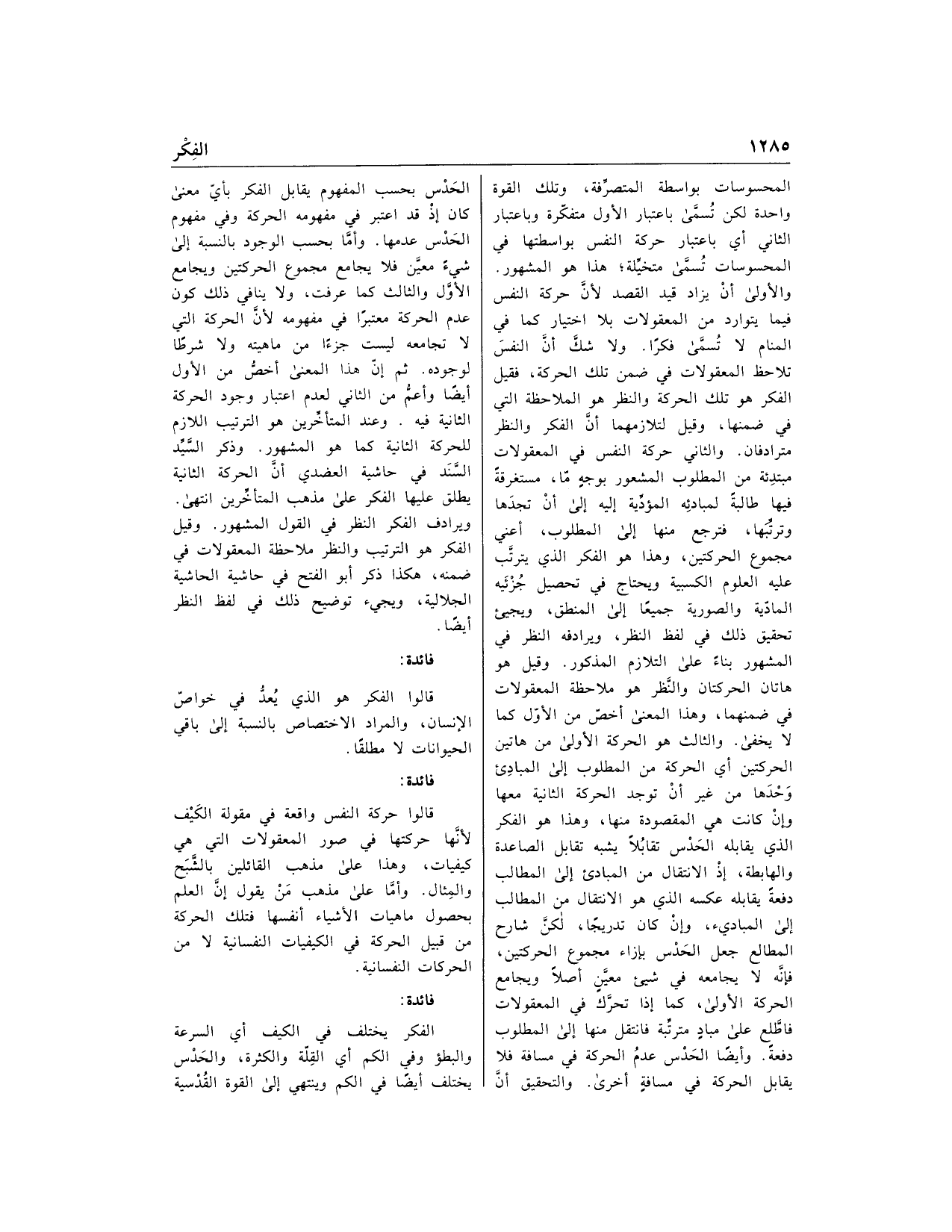 ويرادف الفكر النظر في القول المشهور. وقيل الفكر هو الترتيب والنظر ملاحظة المعقولات في ضمنه، هكذا ذكر أبو الفتح في حاشية الحاشية الجلالية، ويجيء توضيح ذلك في لفظ النظر أيضا.