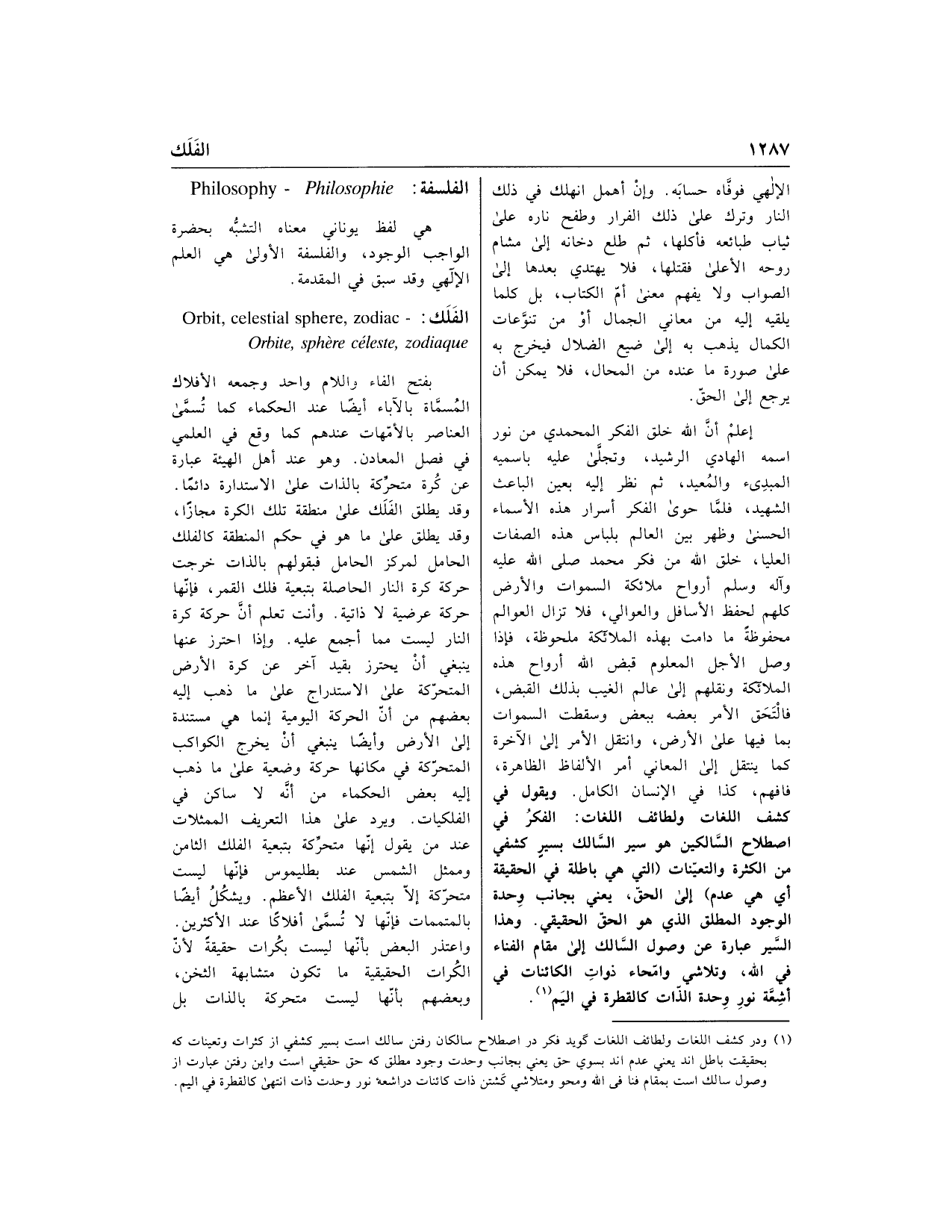 (1) ودر كشف اللغات ولطائف اللغات گويد فكر در اصطلاح سالكان رفتن سالك است بسير كشفي از كثرات وتعينات كه بحقيقت باطل اند يعني عدم اند به سوى حق يعني بجانب وحدت وجود مطلق كه حق حقيقي است واين رفتن عبارت از وصول سالك است بمقام فنا فى الله ومحو ومتلاشي كشتن ذات كائنات در اشعه نور وحدت ذات انتهى كالقطرة في اليم.