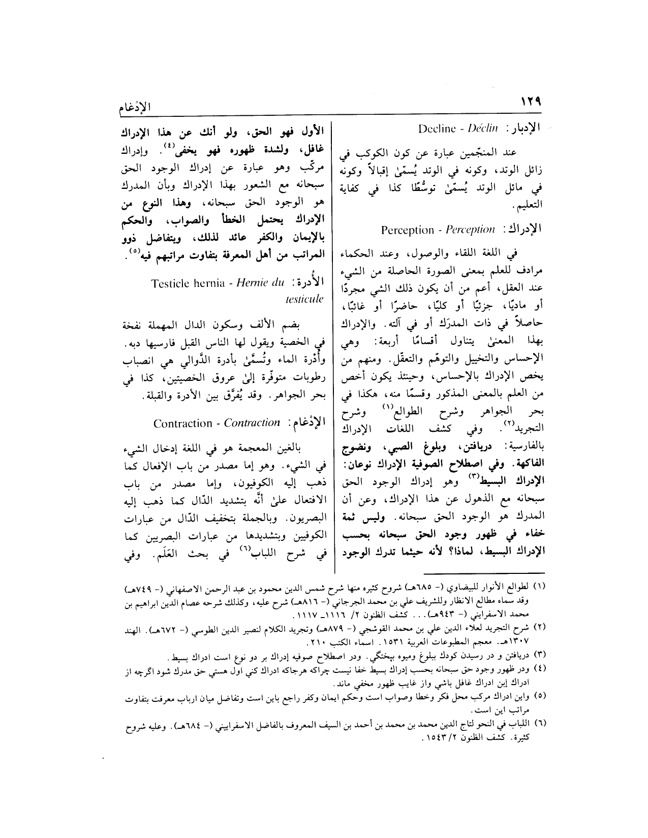 في اللغة اللقاء والوصول، وعند الحكماء مرادف للعلم بمعنى الصورة الحاصلة من الشيء عند العقل، أعم من أن يكون ذلك الشيء مجردا أو ماديا، جزئيا أو كليا، حاضرا أو غائبا، حاصلا في ذات المدرك أو في آلته. والإدراك بهذا المعنى يتناول أقساما أربعة: وهي الإحساس والتخييل والتوهّم والتعقّل. ومنهم من يخص الإدراك بالإحساس، وحينئذ يكون أخص من العلم بالمعنى المذكور وقسما منه، هكذا في بحر الجواهر وشرح الطوالع «1» وشرح التجريد «2». وفي كشف اللغات الإدراك بالفارسية: دريافتن، وبلوغ الصبي، ونضوج الفاكهة. وفي اصطلاح الصوفية الإدراك نوعان:
