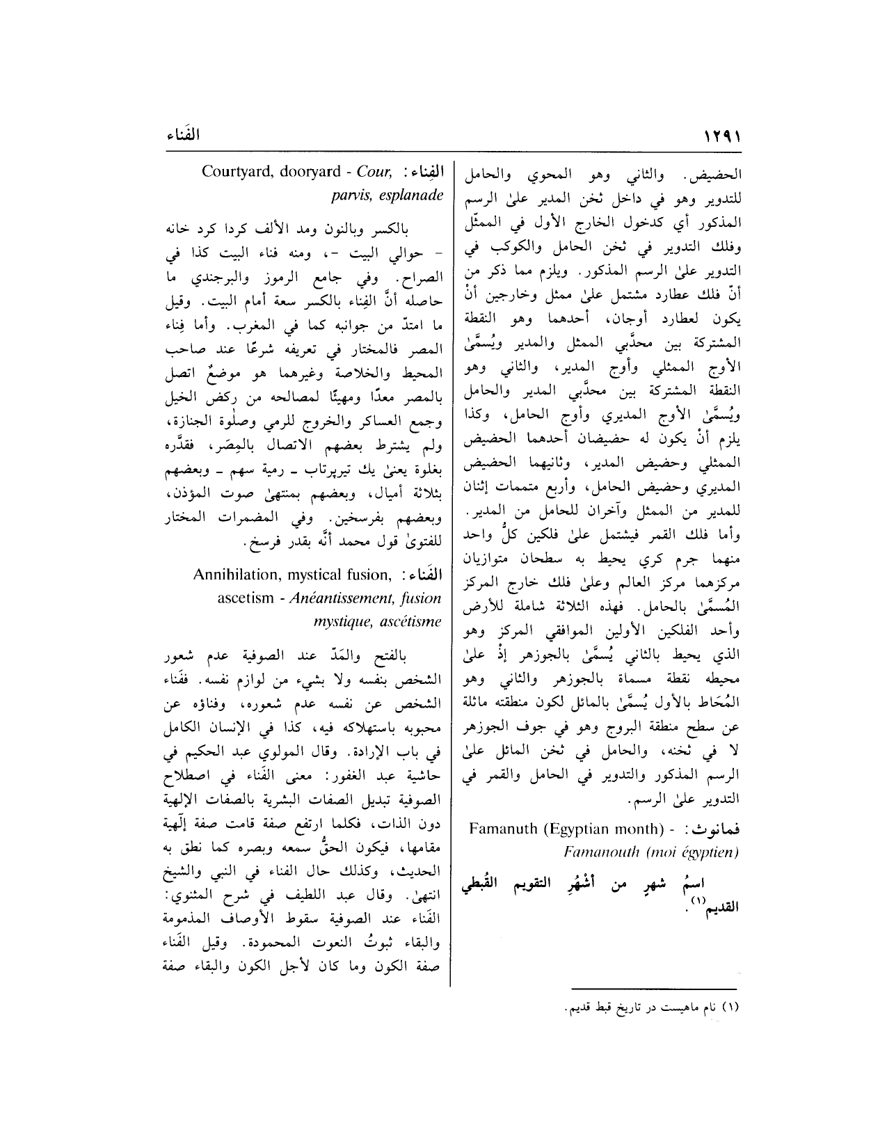 بالكسر وبالنون ومد الألف گرداكرد خانه- حوالي البيت-، ومنه فناء البيت كذا في الصراح. وفي جامع الرموز والبرجندي ما حاصله أنّ الفناء بالكسر سعة أمام البيت. وقيل ما امتدّ من جوانبه كما في المغرب. وأما فناء المصر فالمختار في تعريفه شرعا عند صاحب المحيط والخلاصة وغيرهما هو موضع اتصل بالمصر معدا ومهيئا لمصالحه من ركض الخيل وجمع العساكر والخروج للرمي وصلاة الجنازة، ولم يشترط بعضهم الاتصال بالمصر، فقدّره بغلوة يعنى يك تير پرتاب- رمية سهم- وبعضهم بثلاثة أميال، وبعضهم بمنتهى صوت المؤذن، وبعضهم بفرسخين. وفي المضمرات المختار للفتوى قول محمد أنّه بقدر فرسخ.