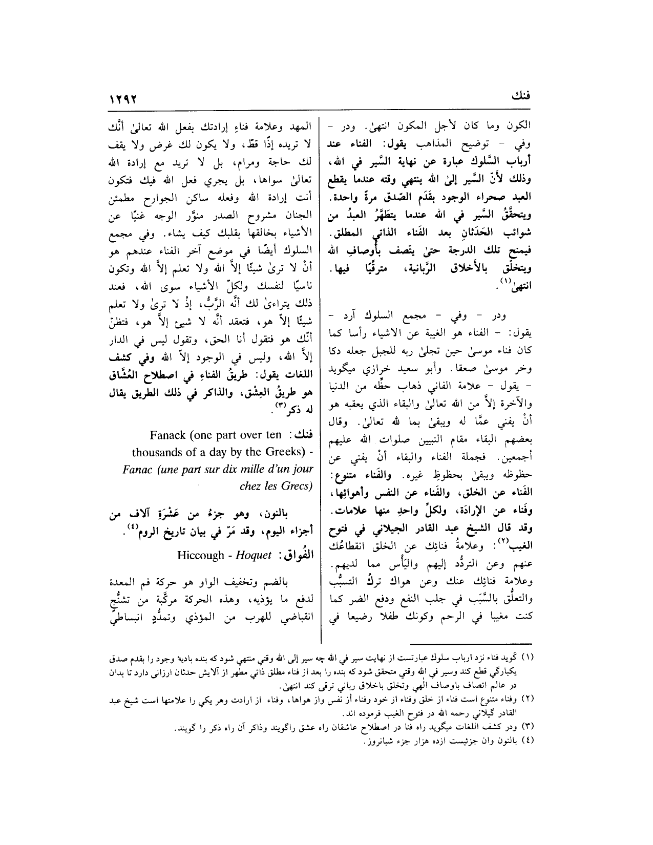 الكون وما كان لأجل المكون انتهى. ودر- وفي- توضيح المذاهب يقول: الفناء عند أرباب السّلوك عبارة عن نهاية السّير في الله، وذلك لأنّ السّير إلى الله ينتهي وقته عند ما يقطع العبد صحراء الوجود بقدم الصّدق مرة واحدة.