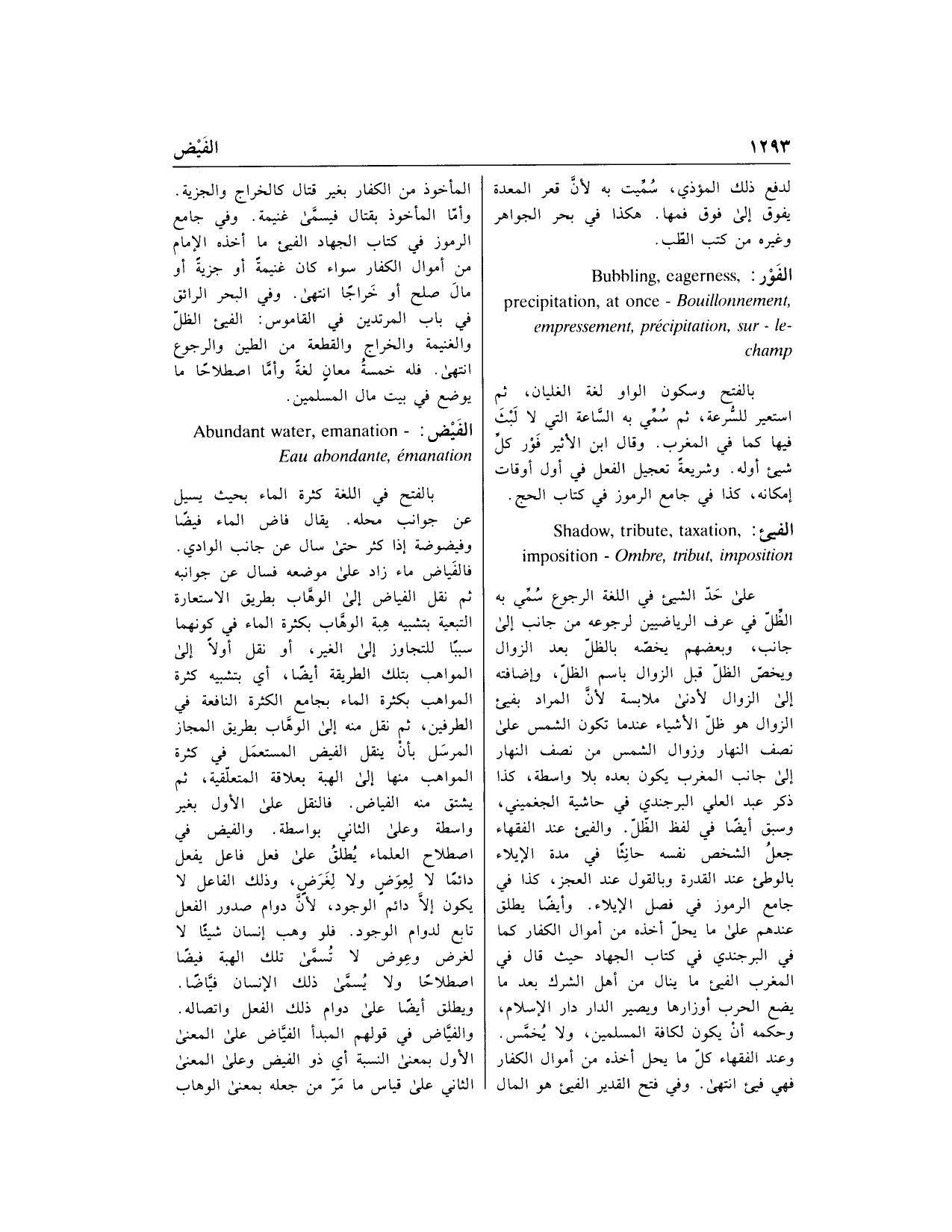على حدّ الشيء في اللغة الرجوع سمّي به الظّلّ في عرف الرياضيين لرجوعه من جانب إلى جانب، وبعضهم يخصّه بالظلّ بعد الزوال ويخصّ الظلّ قبل الزوال باسم الظلّ، وإضافته إلى الزوال لأدنى ملابسة لأنّ المراد بفيء الزوال هو ظلّ الأشياء عند ما تكون الشمس على نصف النهار وزوال الشمس من نصف النهار إلى جانب المغرب يكون بعده بلا واسطة، كذا ذكر عبد العلي البرجندي في حاشية الجغميني، وسبق أيضا في لفظ الظّلّ. والفيء عند الفقهاء جعل الشخص نفسه حانثا في مدة الإيلاء بالوطء عند القدرة وبالقول عند العجز، كذا في جامع الرموز في فصل الإيلاء. وأيضا يطلق عندهم على ما يحلّ أخذه من أموال الكفار كما في البرجندي في كتاب الجهاد حيث قال في المغرب الفيء ما ينال من أهل الشرك بعد ما يضع الحرب أوزارها ويصير الدار دار الإسلام، وحكمه أن يكون لكافة المسلمين، ولا يخمّس.