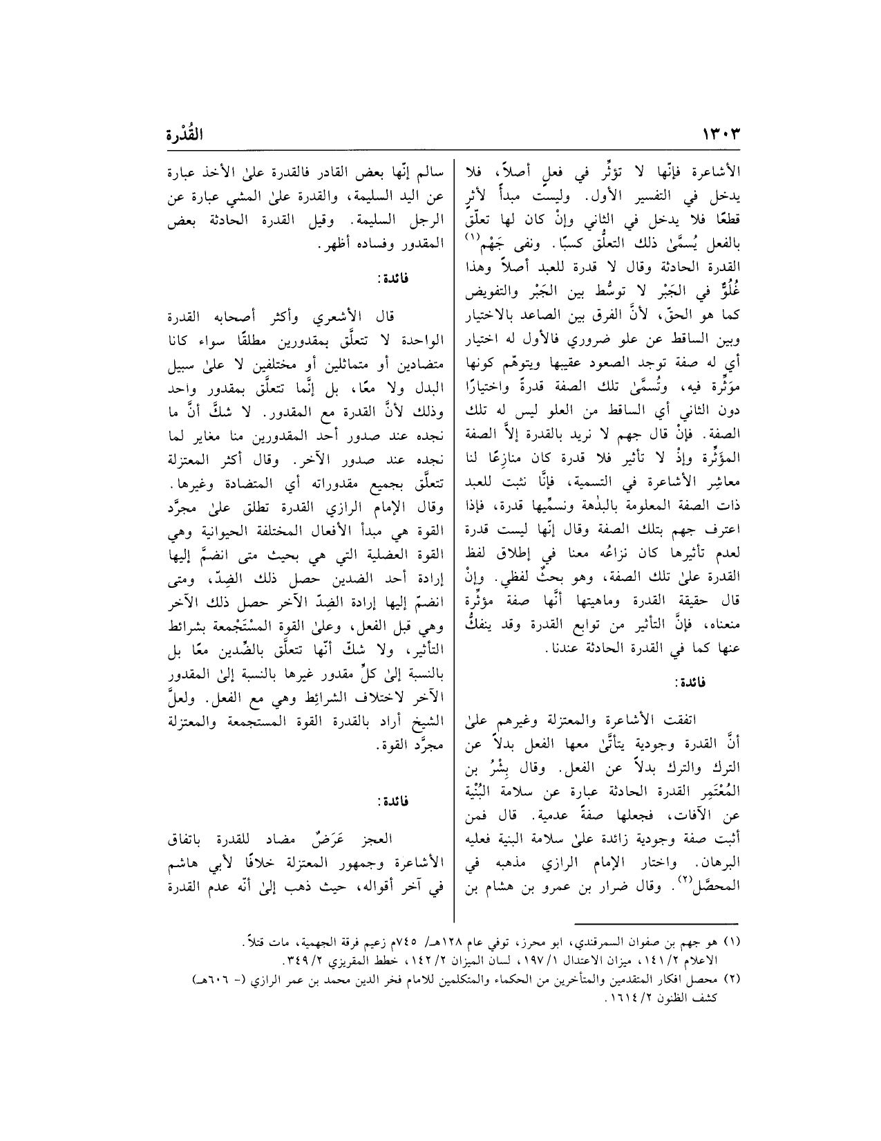 اتفقت الأشاعرة والمعتزلة وغيرهم على أنّ القدرة وجودية يتأتّى معها الفعل بدلا عن الترك والترك بدلا عن الفعل. وقال بشر بن المعتمر القدرة الحادثة عبارة عن سلامة البنية عن الآفات، فجعلها صفة عدمية. قال فمن أثبت صفة وجودية زائدة على سلامة البنية فعليه البرهان. واختار الإمام الرازي مذهبه في المحصّل «2». وقال ضرار بن عمرو بن هشام بن سالم إنّها بعض القادر فالقدرة على الأخذ عبارة عن اليد السليمة، والقدرة على المشي عبارة عن الرجل السليمة. وقيل القدرة الحادثة بعض المقدور وفساده أظهر.