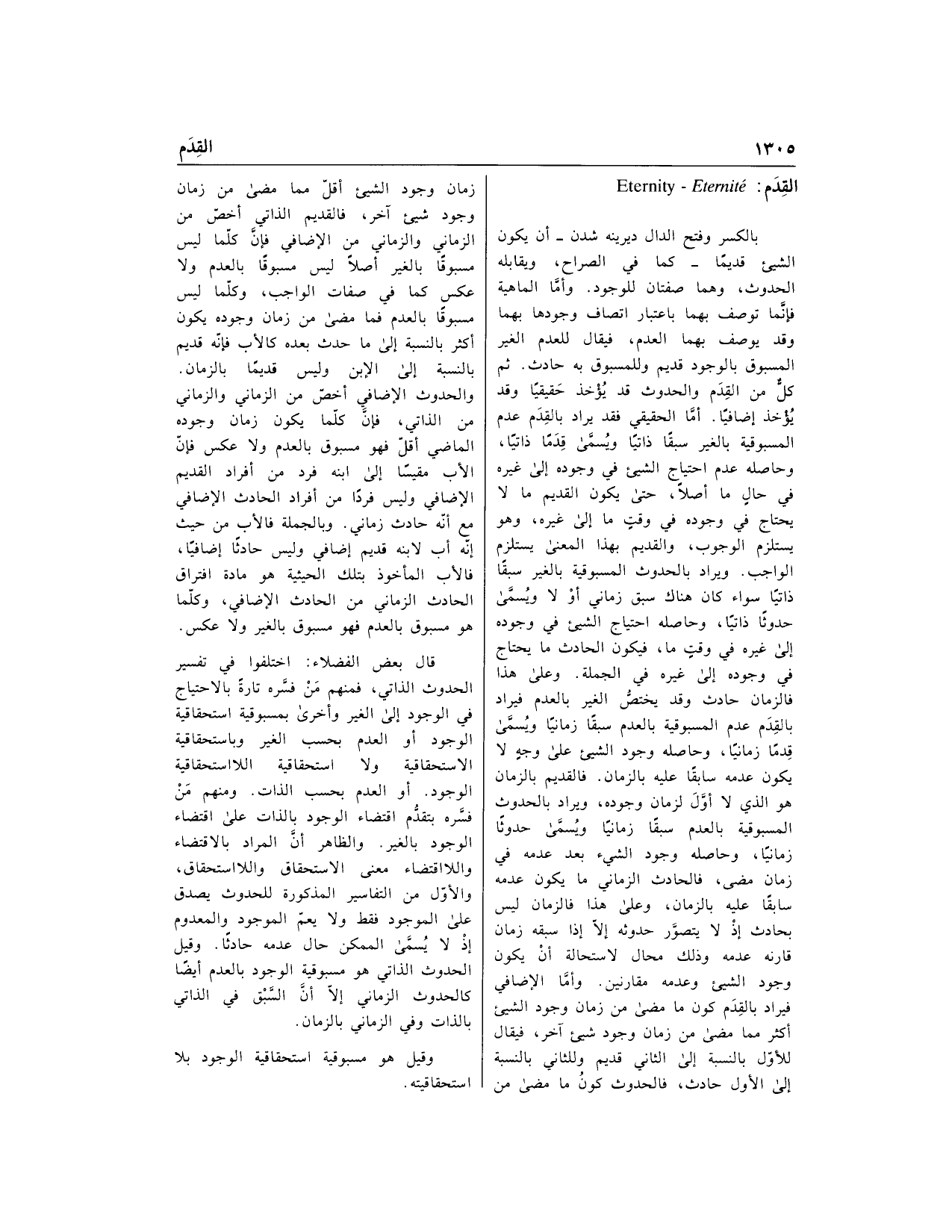 بالكسر وفتح الدال ديرينه شدن- أن يكون الشيء قديما- كما في الصراح، ويقابله الحدوث، وهما صفتان للوجود. وأمّا الماهية فإنّما توصف بهما باعتبار اتصاف وجودها بهما وقد يوصف بهما العدم، فيقال للعدم الغير المسبوق بالوجود قديم وللمسبوق به حادث. ثم كلّ من القدم والحدوث قد يؤخذ حقيقيا وقد يؤخذ إضافيا. أمّا الحقيقي فقد يراد بالقدم عدم المسبوقية بالغير سبقا ذاتيا ويسمّى قدما ذاتيا، وحاصله عدم احتياج الشيء في وجوده إلى غيره في حال ما أصلا، حتى يكون القديم ما لا يحتاج في وجوده في وقت ما إلى غيره، وهو يستلزم الوجوب، والقديم بهذا المعنى يستلزم الواجب. ويراد بالحدوث المسبوقية بالغير سبقا ذاتيا سواء كان هناك سبق زماني أو لا ويسمّى حدوثا ذاتيا، وحاصله احتياج الشيء في وجوده إلى غيره في وقت ما، فيكون الحادث ما يحتاج في وجوده إلى غيره في الجملة. وعلى هذا فالزمان حادث وقد يختصّ الغير بالعدم فيراد بالقدم عدم المسبوقية بالعدم سبقا زمانيا ويسمّى قدما زمانيا، وحاصله وجود الشيء على وجه لا يكون عدمه سابقا عليه بالزمان. فالقديم بالزمان هو الذي لا أوّل لزمان وجوده، ويراد بالحدوث المسبوقية بالعدم سبقا زمانيا ويسمّى حدوثا زمانيّا، وحاصله وجود الشيء بعد عدمه في زمان مضى، فالحادث الزماني ما يكون عدمه سابقا عليه بالزمان، وعلى هذا فالزمان ليس بحادث إذ لا يتصوّر حدوثه إلّا إذا سبقه زمان قارنه عدمه وذلك محال لاستحالة أن يكون وجود الشيء وعدمه مقارنين. وأمّا الإضافي فيراد بالقدم كون ما مضى من زمان وجود الشيء أكثر مما مضى من زمان وجود شيء آخر، فيقال للأوّل بالنسبة إلى الثاني قديم وللثاني بالنسبة إلى الأول حادث، فالحدوث كون ما مضى من زمان وجود الشيء أقلّ مما مضى من زمان وجود شيء آخر، فالقديم الذاتي أخصّ من الزماني والزماني من الإضافي فإنّ كلّما ليس مسبوقا بالغير أصلا ليس مسبوقا بالعدم ولا عكس كما في صفات الواجب، وكلّما ليس مسبوقا بالعدم فما مضى من زمان وجوده يكون أكثر بالنسبة إلى ما حدث بعده كالأب فإنّه قديم بالنسبة إلى الابن وليس قديما بالزمان.