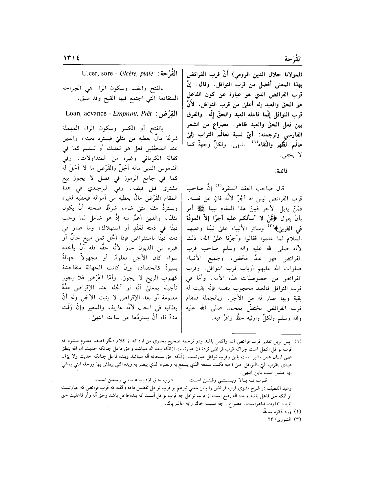 (لمولانا جلال الدين الرومي) أنّ قرب الفرائض بهذا المعنى أفضل من قرب النوافل. وقال: إنّ قرب الفرائض الذي هو عبارة عن كون الفاعل هو الحقّ والعبد إله أعلى من قرب النوافل، لأنّ قرب النوافل إنّما فاعله العبد والحقّ إله. والفرق بين فعل الحقّ والعبد ظاهر. مصراع من الشعر الفارسي وترجمته: أيّ نسبة لعالم التراب إلى عالم الطّهر والنّقاء «1». انتهى. ولكلّ وجهة كما لا يخفى.