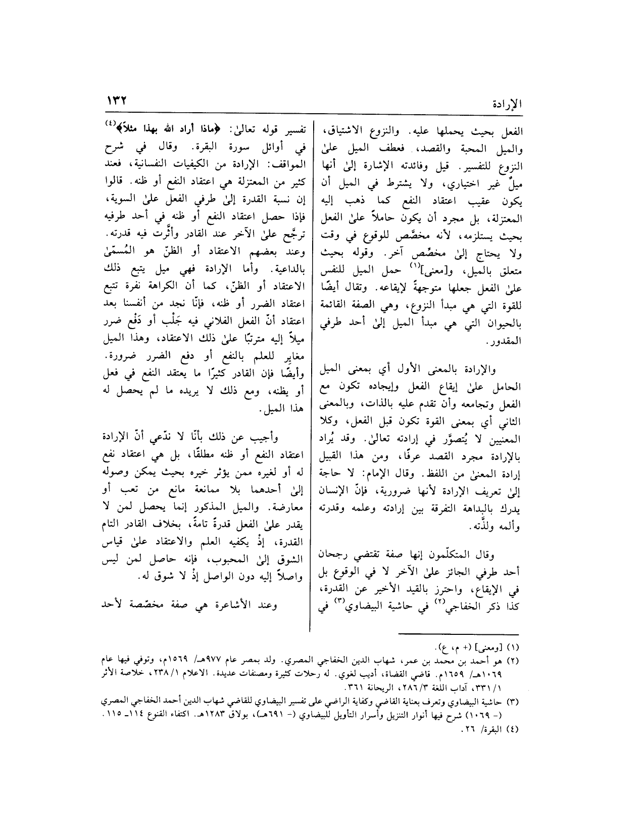 وقال المتكلّمون إنها صفة تقتضي رجحان أحد طرفي الجائز على الآخر لا في الوقوع بل في الإيقاع، واحترز بالقيد الأخير عن القدرة، كذا ذكر الخفاجي «2» في حاشية البيضاوي «3» في تفسير قوله تعالى: ماذا أَرادَ اللَّهُ بِهذا مَثَلًا «4» في أوائل سورة البقرة. وقال في شرح المواقف: الإرادة من الكيفيات النفسانية، فعند كثير من المعتزلة هي اعتقاد النفع أو ظنه. قالوا إن نسبة القدرة إلى طرفي الفعل على السوية، فإذا حصل اعتقاد النفع أو ظنه في أحد طرفيه ترجّح على الآخر عند القادر وأثّرت فيه قدرته.
