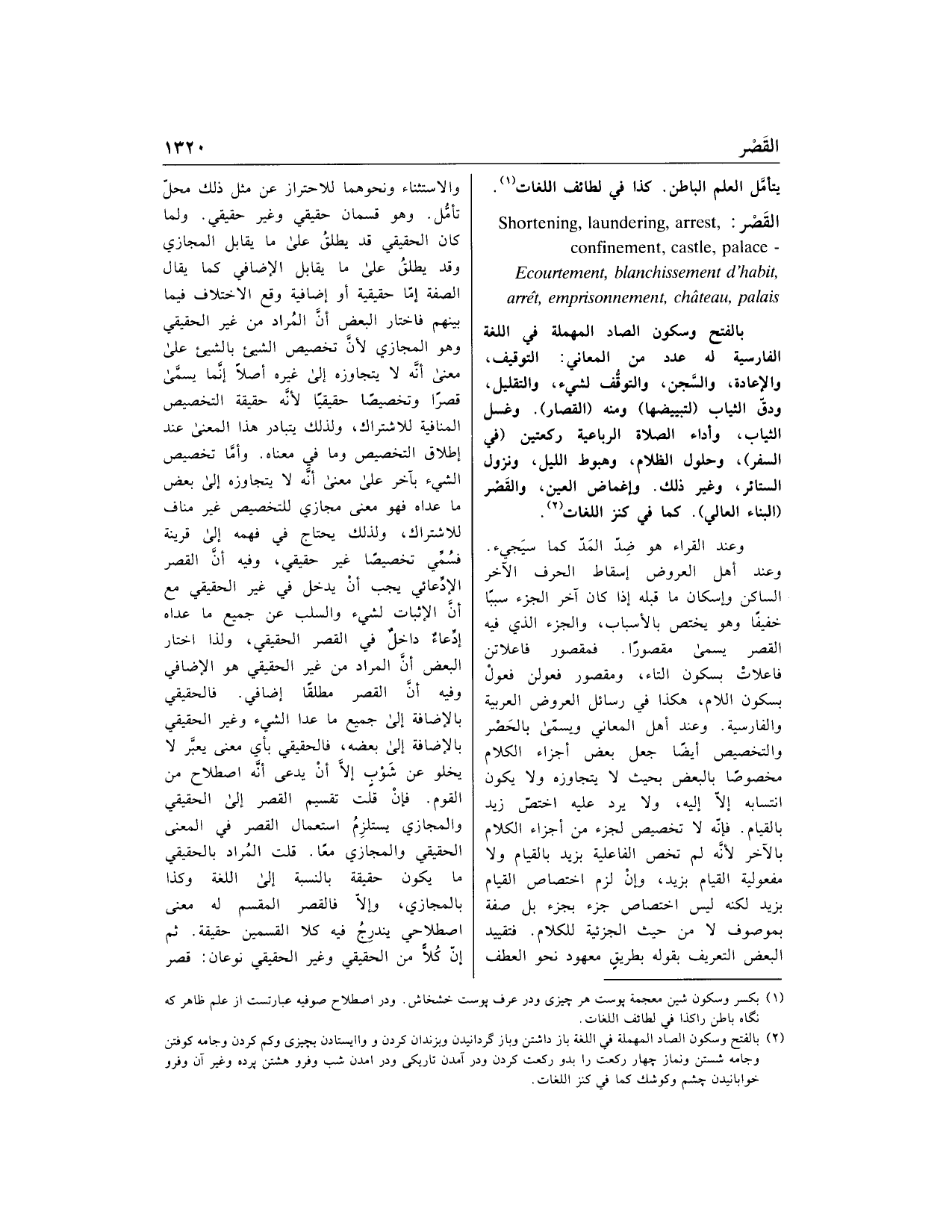 وعند أهل العروض إسقاط الحرف الآخر الساكن وإسكان ما قبله إذا كان آخر الجزء سببا خفيفا وهو يختص بالأسباب، والجزء الذي فيه القصر يسمى مقصورا. فمقصور فاعلاتن فاعلات بسكون التاء، ومقصور فعولن فعول بسكون اللام، هكذا في رسائل العروض العربية والفارسية. وعند أهل المعاني ويسمّى بالحصر والتخصيص أيضا جعل بعض أجزاء الكلام مخصوصا بالبعض بحيث لا يتجاوزه ولا يكون انتسابه إلّا إليه، ولا يرد عليه اختصّ زيد بالقيام. فإنّه لا تخصيص لجزء من أجزاء الكلام بالآخر لأنّه لم تخص الفاعلية بزيد بالقيام ولا مفعولية القيام بزيد، وإن لزم اختصاص القيام بزيد لكنه ليس اختصاص جزء بجزء بل صفة بموصوف لا من حيث الجزئية للكلام. فتقييد البعض التعريف بقوله بطريق معهود نحو العطف والاستثناء ونحوهما للاحتراز عن مثل ذلك محلّ تأمّل. وهو قسمان حقيقي وغير حقيقي. ولما كان الحقيقي قد يطلق على ما يقابل المجازي وقد يطلق على ما يقابل الإضافي كما يقال الصفة إمّا حقيقية أو إضافية وقع الاختلاف فيما بينهم فاختار البعض أنّ المراد من غير الحقيقي وهو المجازي لأنّ تخصيص الشيء بالشيء على معنى أنّه لا يتجاوزه إلى غيره أصلا إنّما يسمّى قصرا وتخصيصا حقيقيا لأنّه حقيقة التخصيص المنافية للاشتراك، ولذلك يتبادر هذا المعنى عند إطلاق التخصيص وما في معناه. وأمّا تخصيص الشيء بآخر على معنى أنّه لا يتجاوزه إلى بعض ما عداه فهو معنى مجازي للتخصيص غير مناف للاشتراك، ولذلك يحتاج في فهمه إلى قرينة فسمّي تخصيصا غير حقيقي، وفيه أنّ القصر الادّعائي يجب أن يدخل في غير الحقيقي مع أنّ الإثبات لشيء والسلب عن جميع ما عداه ادّعاء داخل في القصر الحقيقي، ولذا اختار البعض أنّ المراد من غير الحقيقي هو الإضافي وفيه أنّ القصر مطلقا إضافي. فالحقيقي بالإضافة إلى جميع ما عدا الشيء وغير الحقيقي بالإضافة إلى بعضه، فالحقيقي بأي معنى يعبّر لا يخلو عن شوب إلّا أن يدعى أنّه اصطلاح من القوم. فإن قلت تقسيم القصر إلى الحقيقي والمجازي يستلزم استعمال القصر في المعنى الحقيقي والمجازي معا. قلت المراد بالحقيقي ما يكون حقيقة بالنسبة إلى اللغة وكذا بالمجازي، وإلّا فالقصر المقسم له معنى اصطلاحي يندرج فيه كلا القسمين حقيقة. ثم إنّ كلّا من الحقيقي وغير الحقيقي نوعان: قصر