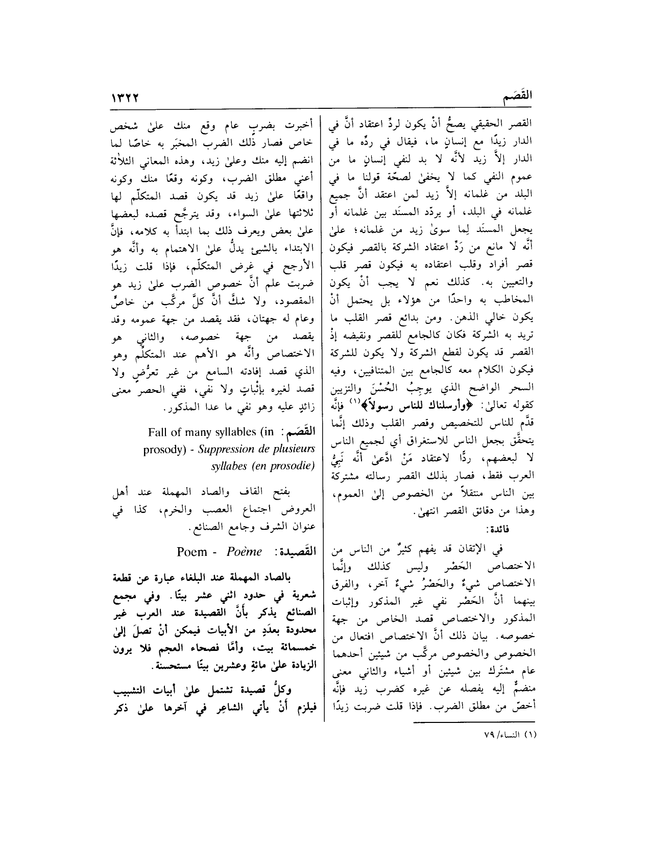 القصر الحقيقي يصحّ أن يكون لردّ اعتقاد أنّ في الدار زيدا مع إنسان ما، فيقال في ردّه ما في الدار إلّا زيد لأنّه لا بد لنفي إنسان ما من عموم النفي كما لا يخفى لصحّة قولنا ما في البلد من غلمانه إلّا زيد لمن اعتقد أنّ جميع غلمانه في البلد، أو يردّد المسند بين غلمانه أو يجعل المسند لما سوى زيد من غلمانه؛ على أنّه لا مانع من ردّ اعتقاد الشركة بالقصر فيكون قصر أفراد وقلب اعتقاده به فيكون قصر قلب والتعيين به. كذلك نعم لا يجب أن يكون المخاطب به واحدا من هؤلاء بل يحتمل أن يكون خالي الذهن. ومن بدائع قصر القلب ما تريد به الشركة فكان كالجامع للقصر ونقيضه إذ القصر قد يكون لقطع الشركة ولا يكون للشركة فيكون الكلام معه كالجامع بين المتنافيين، وفيه السحر الواضح الذي يوجب الحسن والتزيين كقوله تعالى: وَأَرْسَلْناكَ لِلنَّاسِ رَسُولًا «1» فإنّه قدّم للناس للتخصيص وقصر القلب وذلك إنّما يتحقّق بجعل الناس للاستغراق أي لجميع الناس لا لبعضهم، ردّا لاعتقاد من ادّعى أنّه نبيّ العرب فقط، فصار بذلك القصر رسالته مشتركة بين الناس منتقلا من الخصوص إلى العموم، وهذا من دقائق القصر انتهى.