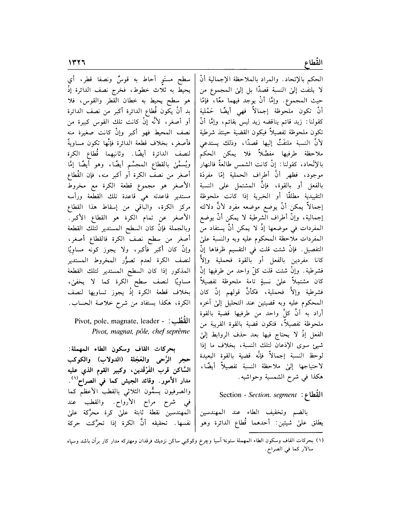 بالضم وتخفيف الطاء عند المهندسين يطلق على شيئين: أحدهما قطاع الدائرة وهو سطح مستو أحاط به قوس ونصفا قطر، أي يحيط به ثلاث خطوط، فخرج نصف الدائرة إذ هو سطح يحيط به خطان القطر والقوس، فلا بد أن يكون قطاع الدائرة أكبر من نصف الدائرة أو أصغر، لأنّه إن كانت تلك القوس كبيرة من نصف المحيط فهو أكبر وإن كانت صغيرة منه فأصغر، بخلاف قطعة الدائرة فإنّها تكون مساوية لنصف الدائرة أيضا. وثانيهما قطاع الكرة ويسمّى بالقطاع المجسّم أيضا، وهو أيضا إمّا أصغر من نصف الكرة أو أكبر منه، فإن القطاع الأصغر هو مجموع قطعة الكرة مع مخروط مستدير قاعدته هي قاعدة تلك القطعة ورأسه مركز الكرة، والباقي من إسقاط هذا القطاع الأصغر عن تمام الكرة هو القطاع الأكبر.
