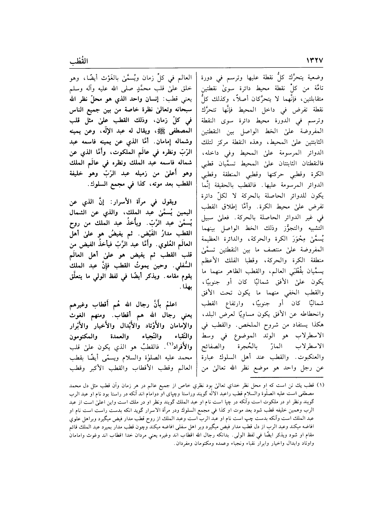 وضعية يتحرّك كلّ نقطة عليها وترسم في دورة تامّة من كلّ نقطة محيط دائرة سوى نقطتين متقابلتين، فإنّهما لا يتحرّكان أصلا، وكذلك كلّ نقطة تفرض في داخل المحيط فإنّها تتحرّك وترسم في الدورة محيط دائرة سوى النقطة المفروضة على الخط الواصل بين النقطتين الثابتتين على المحيط، وهذه النقطة مركز لتلك الدوائر المرسومة على المحيط وفي داخله، فالنقطتان الثابتتان على المحيط تسمّيان قطبي الكرة وقطبي حركتها وقطبي المنطقة وقطبي الدوائر المرسومة عليها. فالقطب بالحقيقة إنّما يكون للدوائر الحاصلة بالحركة لا لكلّ دائرة تفرض على محيط الكرة. وأمّا إطلاق القطب في غير الدوائر الحاصلة بالحركة. فعلى سبيل التشبيه والتجوّز وذلك الخط الواصل بينهما يسمّى محور الكرة والحركة، والدائرة العظيمة المفروضة على منتصف ما بين النقطتين تسمّى منطقة الكرة والحركة، وقطبا الفلك الأعظم يسمّيان بقطبي العالم، والقطب الظاهر منهما ما يكون على الأفق شماليا كان أو جنوبيا، والقطب الخفي منهما ما يكون تحت الأفق شماليا كان أو جنوبيا، وارتفاع القطب وانحطاطه عن الأفق يكون مساويا لعرض البلد، هكذا يستفاد من شروح الملخص. والقطب في الاسطرلاب هو الوتد الموضوع في وسط الاسطرلاب المارّ بالحجرة والصفائح والعنكبوت. والقطب عند أهل السلوك عبارة عن رجل واحد هو موضع نظر الله تعالى من العالم في كلّ زمان ويسمّى بالغوث أيضا، وهو خلق على قلب محمّد صلى الله عليه وآله وسلم يعني قطب: إنسان واحد الذي هو محلّ نظر الله سبحانه وتعالى نظرة خاصة من بين جميع الناس في كلّ زمان، وذلك القطب على مثل قلب المصطفى صلى الله عليه وسلم، ويقال له عبد الإله، وعن يمينه وشماله إمامان. أمّا الذي عن يمينه فاسمه عبد الرّبّ ونظره في عالم الملكوت، وأمّا الذي عن شماله فاسمه عبد الملك ونظره في عالم الملك وهو أعلى من زميله عبد الرّبّ وهو خليفة القطب بعد موته، كذا في مجمع السلوك.
