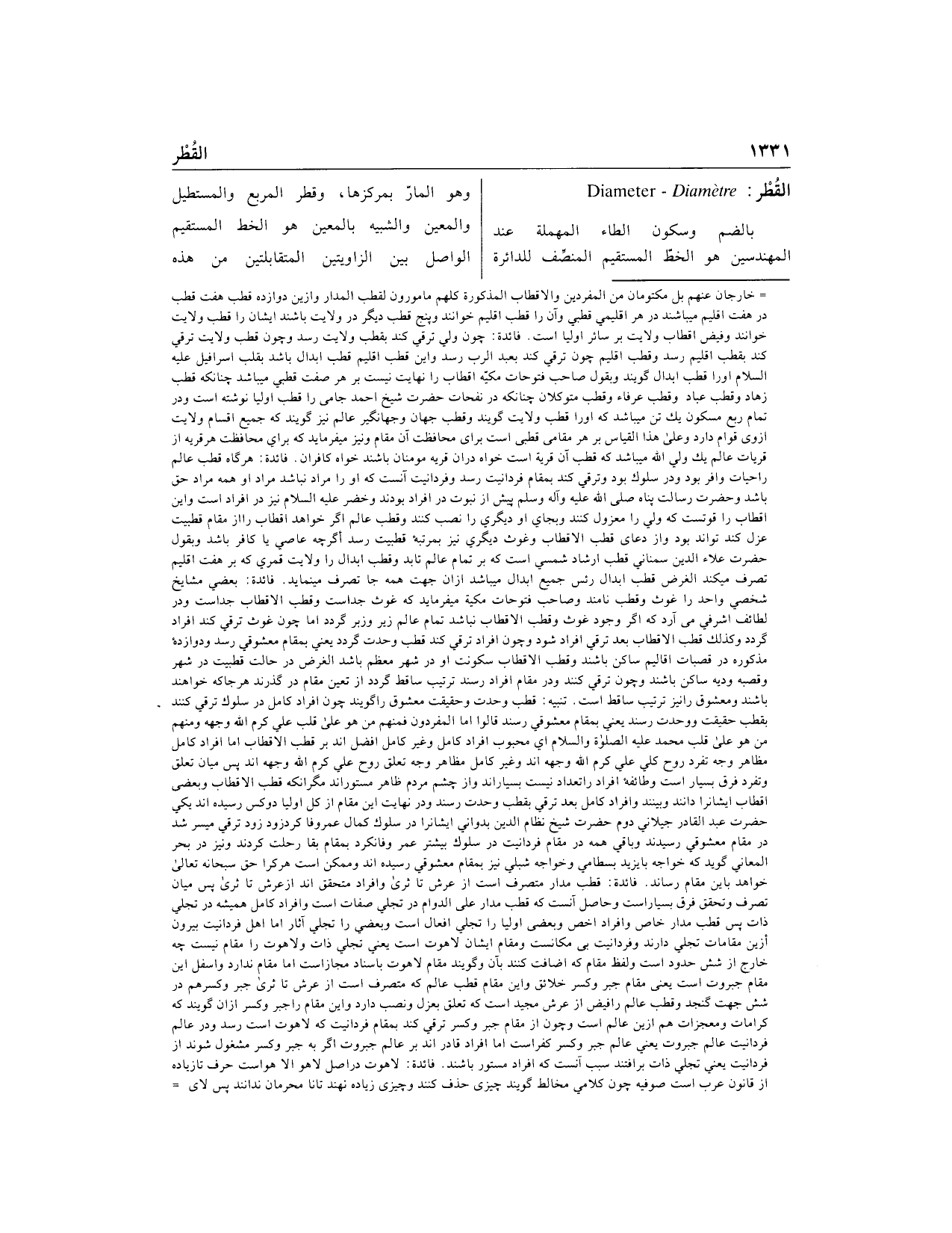 وتحقق فرق بسيار است وحاصل آنست كه قطب مدار على الدوام در تجلي صفات است وافراد كامل هميشه در تجلي ذات پس قطب مدار خاص وافراد اخص وبعضى اوليا را تجلي افعال است وبعضي را تجلى آثار اما اهل فردانيت بيرون أزين مقامات تجلي دارند وفردانيت بى مكانست ومقام ايشان لاهوت است يعني تجلي ذات ولاهوت را مقام نيست چهـ خارج از شش حدود است ولفظ مقام كه اضافت كنند بآن وگويند مقام لاهوت باسناد مجاز است اما مقام ندارد واسفل اين مقام جبروت است يعنى مقام جبر وكسر خلائق واين مقام قطب عالم كه متصرف است از عرش تا ثرى جبر وكسرهم در شش جهت گنجد وقطب عالم را فيض از عرش مجيد است كه تعلق بعزل ونصب دارد واين مقام را جبر وكسر از ان گويند كه كرامات ومعجزات هم ازين عالم است وچون از مقام جبر وكسر ترقي كند بمقام فردانيت كه لاهوت است رسد ودر عالم فردانيت عالم جبروت يعني عالم جبر وكسر كفر است اما افراد قادراند بر عالم جبروت اگر به جبر وكسر مشغول شوند از فردانيت يعني تجلي ذات بر افتند سبب آنست كه افراد مستور باشند. فائدة: لاهوت در اصل لا هو الا هو است حرف تا زياده از قانون عرب است صوفيه چون كلامي مخالط گويند چيزى حذف كنند وچيزى زياده نهند تا نامحرمان ندانند پس لاى-