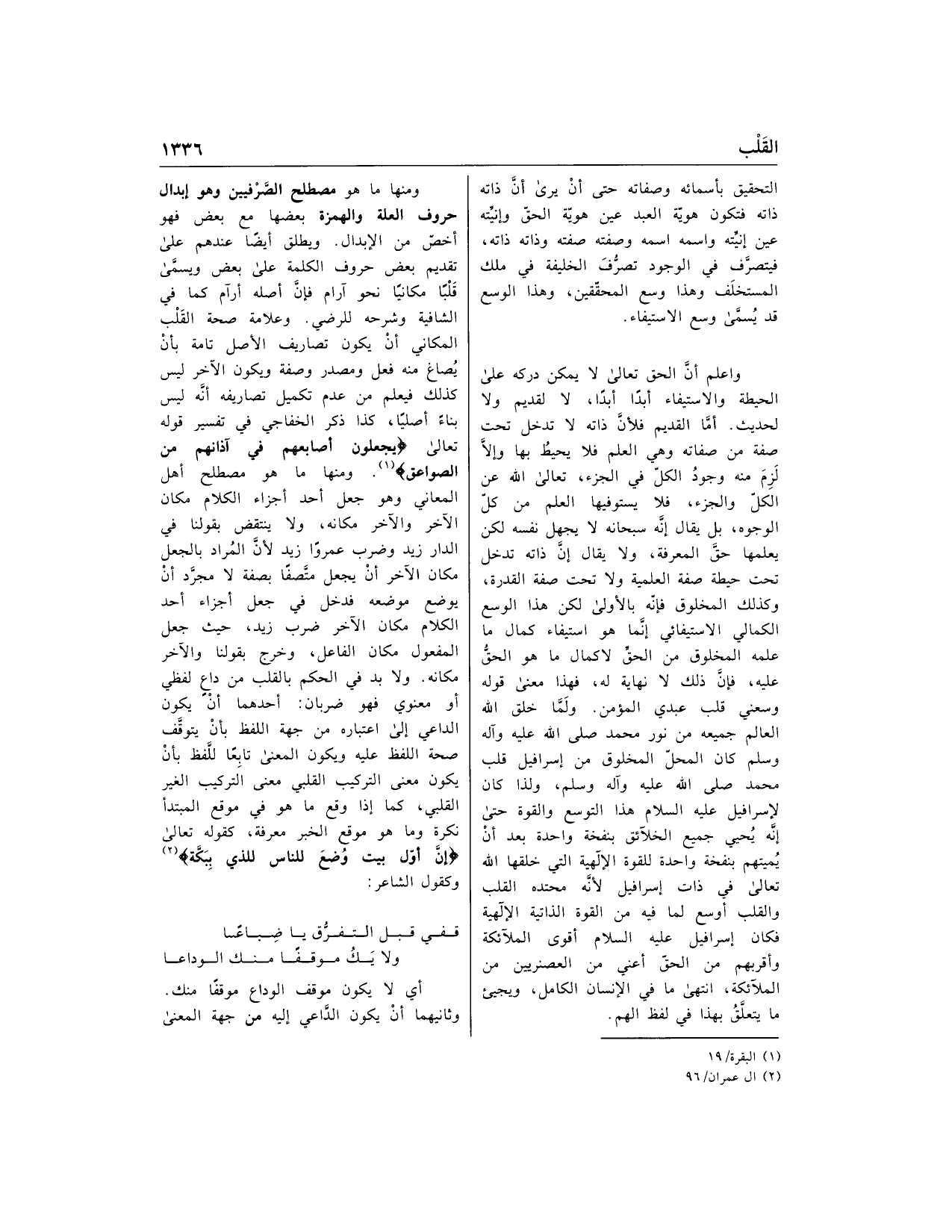 ومنها ما هو مصطلح الصّرفيين وهو إبدال حروف العلة والهمزة بعضها مع بعض فهو أخصّ من الإبدال. ويطلق أيضا عندهم على تقديم بعض حروف الكلمة على بعض ويسمّى قلبا مكانيا نحو آرام فإنّ أصله أرام كما في الشافية وشرحه للرضي. وعلامة صحة القلب المكاني أن يكون تصاريف الأصل تامة بأن يصاغ منه فعل ومصدر وصفة ويكون الآخر ليس كذلك فيعلم من عدم تكميل تصاريفه أنّه ليس بناء أصليا، كذا ذكر الخفاجي في تفسير قوله تعالى يَجْعَلُونَ أَصابِعَهُمْ فِي آذانِهِمْ مِنَ الصَّواعِقِ «1». ومنها ما هو مصطلح أهل المعاني وهو جعل أحد أجزاء الكلام مكان الآخر والآخر مكانه، ولا ينتقض بقولنا في الدار زيد وضرب عمروا زيد لأنّ المراد بالجعل مكان الآخر أن يجعل متّصفا بصفة لا مجرّد أن يوضع موضعه فدخل في جعل أجزاء أحد الكلام مكان الآخر ضرب زيد، حيث جعل المفعول مكان الفاعل، وخرج بقولنا والآخر مكانه. ولا بد في الحكم بالقلب من داع لفظي أو معنوي فهو ضربان: أحدهما أن يكون الداعي إلى اعتباره من جهة اللفظ بأن يتوقّف صحة اللفظ عليه ويكون المعنى تابعا للّفظ بأن يكون معنى التركيب القلبي معنى التركيب الغير القلبي، كما إذا وقع ما هو في موقع المبتدأ نكرة وما هو موقع الخبر معرفة، كقوله تعالى إِنَّ أَوَّلَ بَيْتٍ وُضِعَ لِلنَّاسِ لَلَّذِي بِبَكَّةَ «2» وكقول الشاعر: