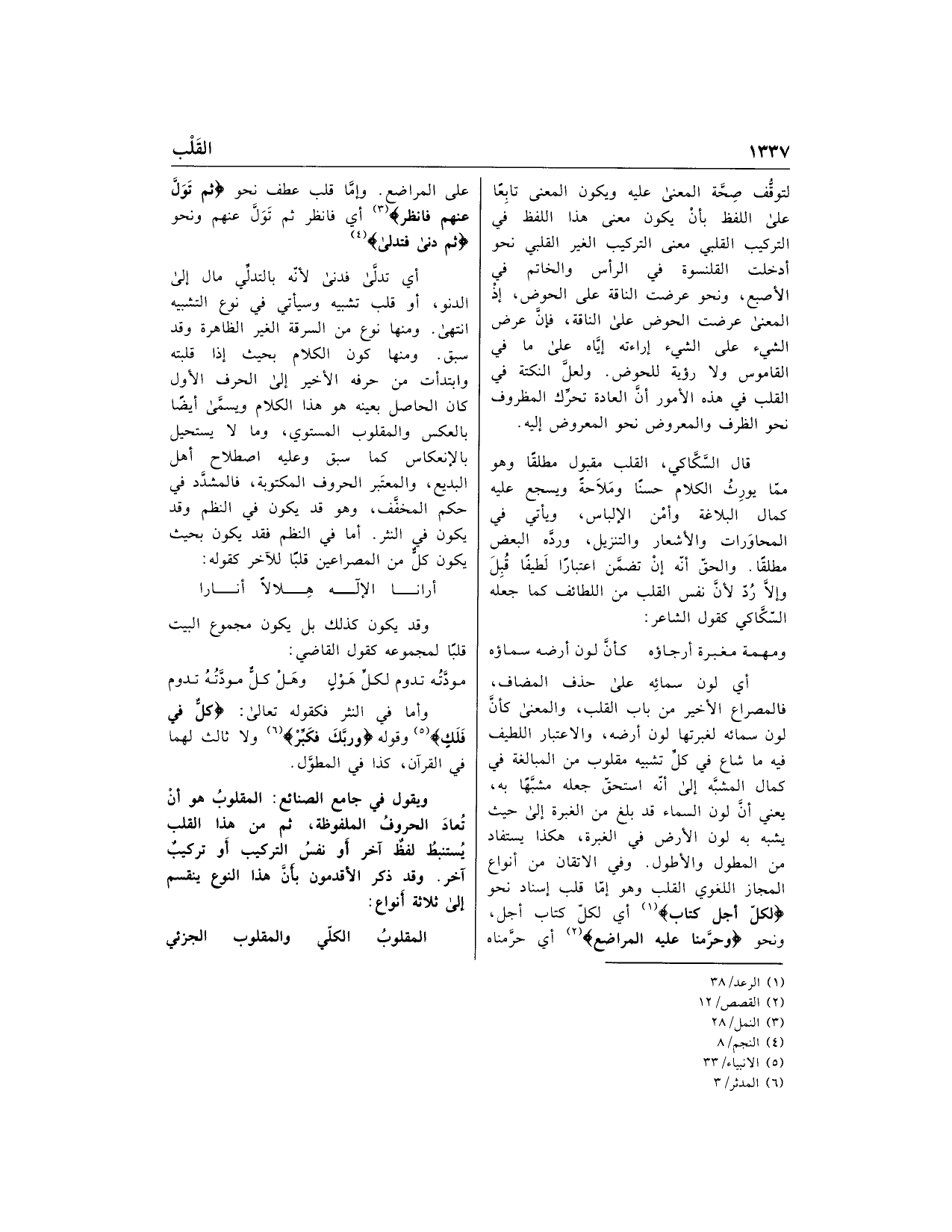 ومهمة مغبرة أرجاؤه كأنّ لون أرضه سماؤه أي لون سمائه على حذف المضاف، فالمصراع الأخير من باب القلب، والمعنى كأنّ لون سمائه لغبرتها لون أرضه، والاعتبار اللطيف فيه ما شاع في كلّ تشبيه مقلوب من المبالغة في كمال المشبّه إلى أنّه استحقّ جعله مشبّها به، يعني أنّ لون السماء قد بلغ من الغبرة إلى حيث يشبه به لون الأرض في الغبرة، هكذا يستفاد من المطول والأطول. وفي الاتقان من أنواع المجاز اللغوي القلب وهو إمّا قلب إسناد نحو لِكُلِّ أَجَلٍ كِتابٌ «1» أي لكلّ كتاب أجل، ونحو وَحَرَّمْنا عَلَيْهِ الْمَراضِعَ «2» أي حرّمناه على المراضع. وإمّا قلب عطف نحو ثُمَّ تَوَلَّ عَنْهُمْ فَانْظُرْ «3» أي فانظر ثم تولّ عنهم ونحو ثُمَّ دَنا فَتَدَلَّى «4»