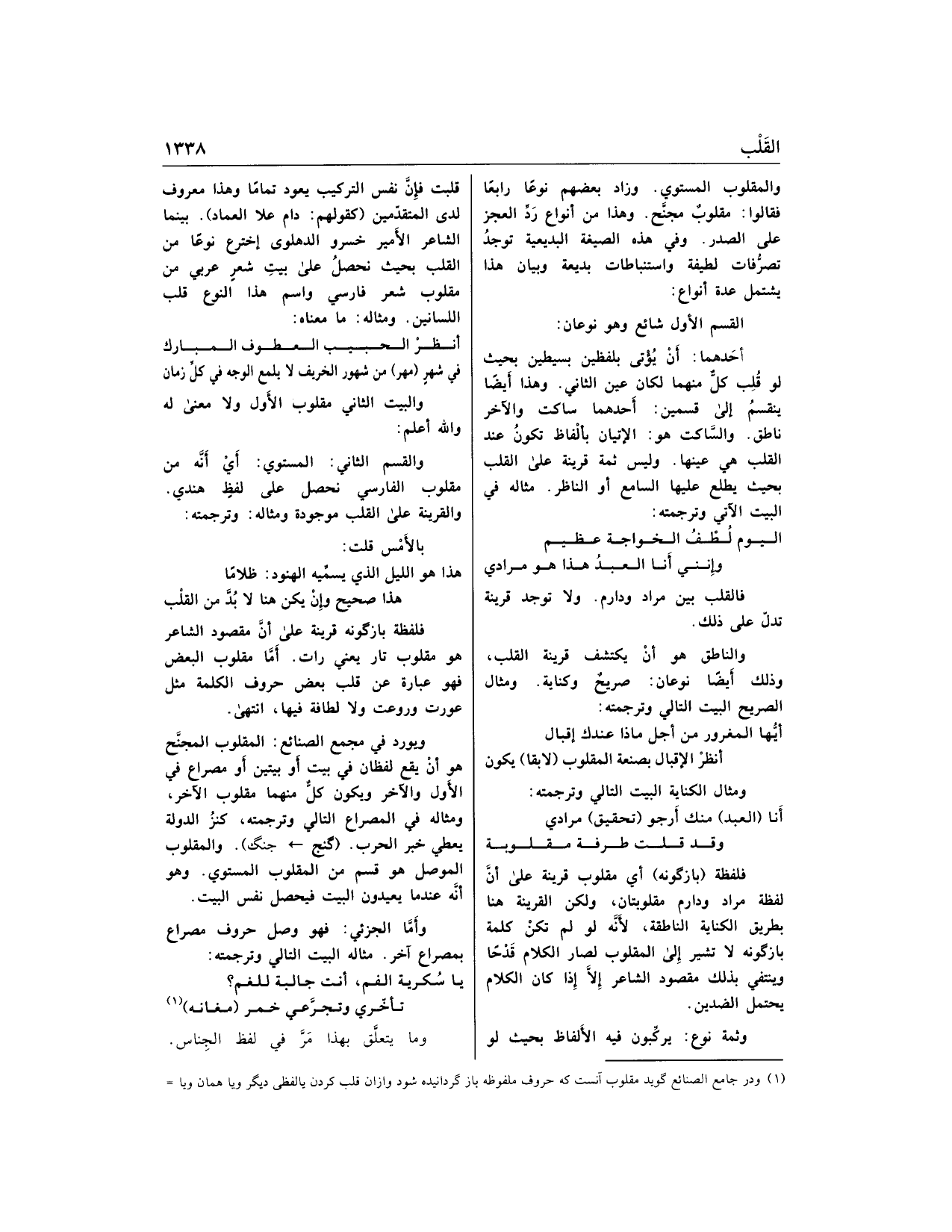 (1) ودر جامع الصنائع گويد مقلوب آنست كه حروف ملفوظه بازگردانيده شود واز ان قلب كردن يا لفظى ديگر ويا همان ويا-