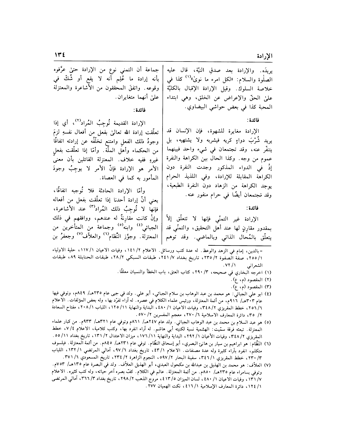وأمّا الإرادة الحادثة فلا توجبه اتفاقا، يعني أنّ إرادة أحدنا إذا تعلّقت بفعل من أفعاله فإنها لا توجب ذلك المراد «3» عند الأشاعرة، وإن كانت مقارنة له عندهم، ووافقهم في ذلك الجبائي «4» وابنه «5» وجماعة من المتأخرين من المعتزلة. وجوّز النّظام «6» والعلّاف «7» وجعفر بن