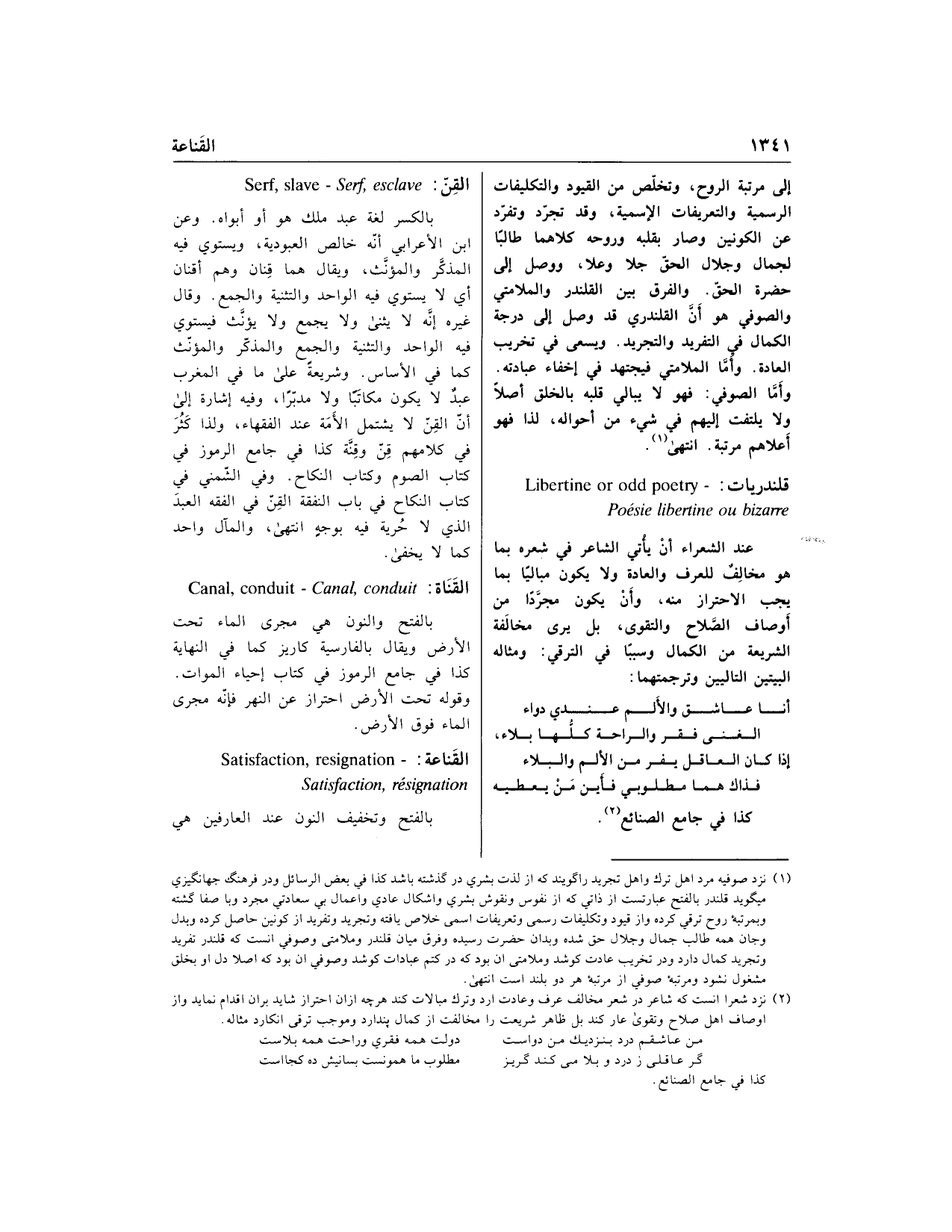 (1) نزد صوفيه مرد اهل ترك واهل تجريد را گويند كه از لذت بشري در گذشته باشد كذا في بعض الرسائل ودر فرهنگ جهانگيري ميگويد قلندر بالفتح عبارتست از ذاتي كه از نفوس ونقوش بشري واشكال عادي واعمال بى سعادتى مجرد وبا صفا گشته وبه مرتبه روح ترقي كرده واز قيود وتكليفات رسمى وتعريفات اسمى خلاص يافته وتجريد وتفريد از كونين حاصل كرده وبدل وجان همه طالب جمال وجلال حق شده وبدان حضرت رسيده وفرق ميان قلندر وملامتى وصوفي آنست كه قلندر تفريد وتجريد كمال دارد ودر تخريب عادت كوشد وملامتى ان بود كه در كتم عبادات كوشد وصوفي ان بود كه اصلا دل او بخلق مشغول نشود ومرتبه صوفي از مرتبه هر دو بلند است انتهى.