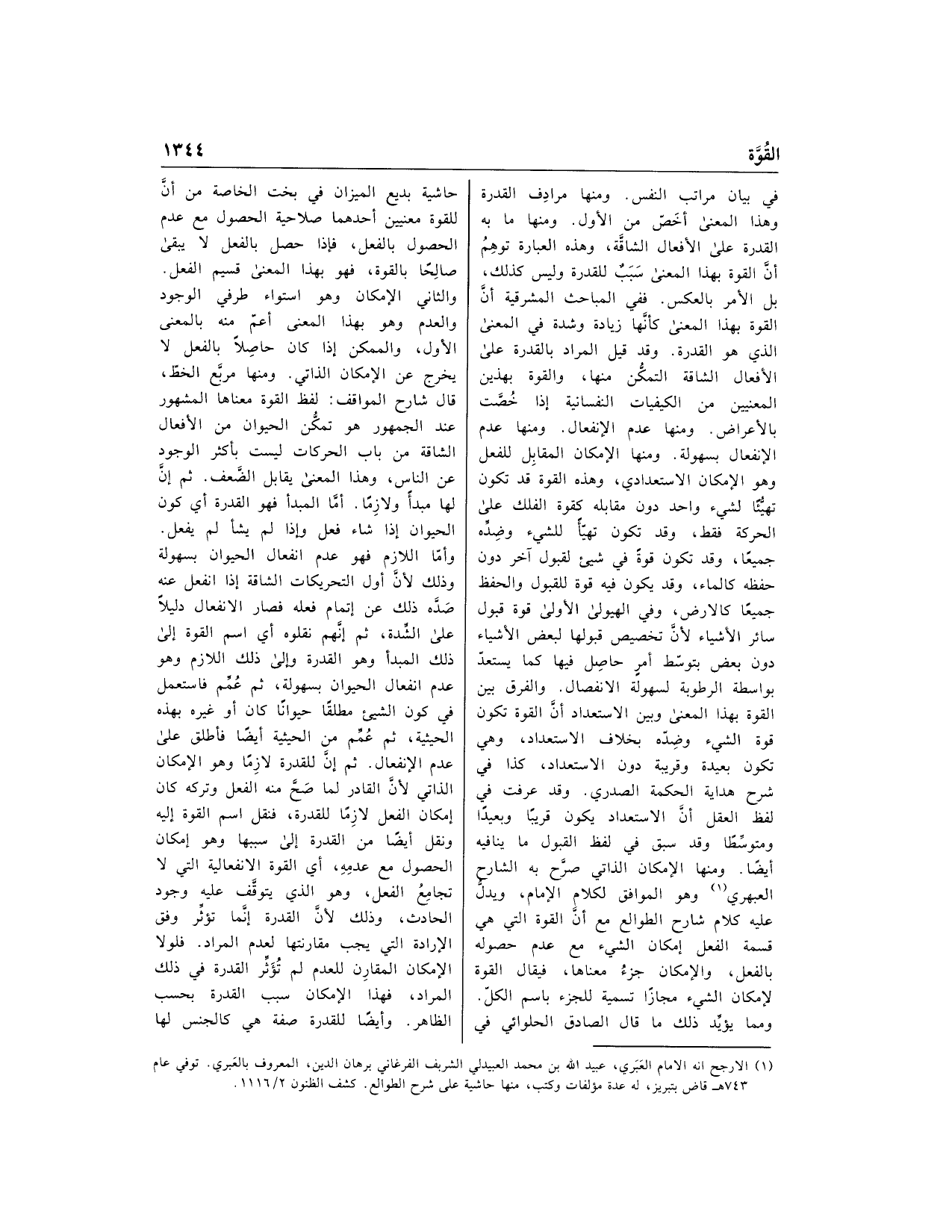 في بيان مراتب النفس. ومنها مرادف القدرة وهذا المعنى أخصّ من الأول. ومنها ما به القدرة على الأفعال الشاقّة، وهذه العبارة توهم أنّ القوة بهذا المعنى سبب للقدرة وليس كذلك، بل الأمر بالعكس. ففي المباحث المشرقية أنّ القوة بهذا المعنى كأنّها زيادة وشدة في المعنى الذي هو القدرة. وقد قيل المراد بالقدرة على الأفعال الشاقة التمكّن منها، والقوة بهذين المعنيين من الكيفيات النفسانية إذا خصّت بالأعراض. ومنها عدم الانفعال. ومنها عدم الانفعال بسهولة. ومنها الإمكان المقابل للفعل وهو الإمكان الاستعدادي، وهذه القوة قد تكون تهيّئا لشيء واحد دون مقابله كقوة الفلك على الحركة فقط، وقد تكون تهيّأ للشيء وضدّه جميعا، وقد تكون قوة في شيء لقبول آخر دون حفظه كالماء، وقد يكون فيه قوة للقبول والحفظ جميعا كالارض، وفي الهيولى الأولى قوة قبول سائر الأشياء لأنّ تخصيص قبولها لبعض الأشياء دون بعض بتوسّط أمر حاصل فيها كما يستعدّ بواسطة الرطوبة لسهولة الانفصال. والفرق بين القوة بهذا المعنى وبين الاستعداد أنّ القوة تكون قوة الشيء وضدّه بخلاف الاستعداد، وهي تكون بعيدة وقريبة دون الاستعداد، كذا في شرح هداية الحكمة الصدري. وقد عرفت في لفظ العقل أنّ الاستعداد يكون قريبا وبعيدا ومتوسّطا وقد سبق في لفظ القبول ما ينافيه أيضا. ومنها الإمكان الذاتي صرّح به الشارح العبهري «1» وهو الموافق لكلام الإمام، ويدلّ عليه كلام شارح الطوالع مع أنّ القوة التي هي قسمة الفعل إمكان الشيء مع عدم حصوله بالفعل، والإمكان جزء معناها، فيقال القوة لإمكان الشيء مجازا تسمية للجزء باسم الكلّ.