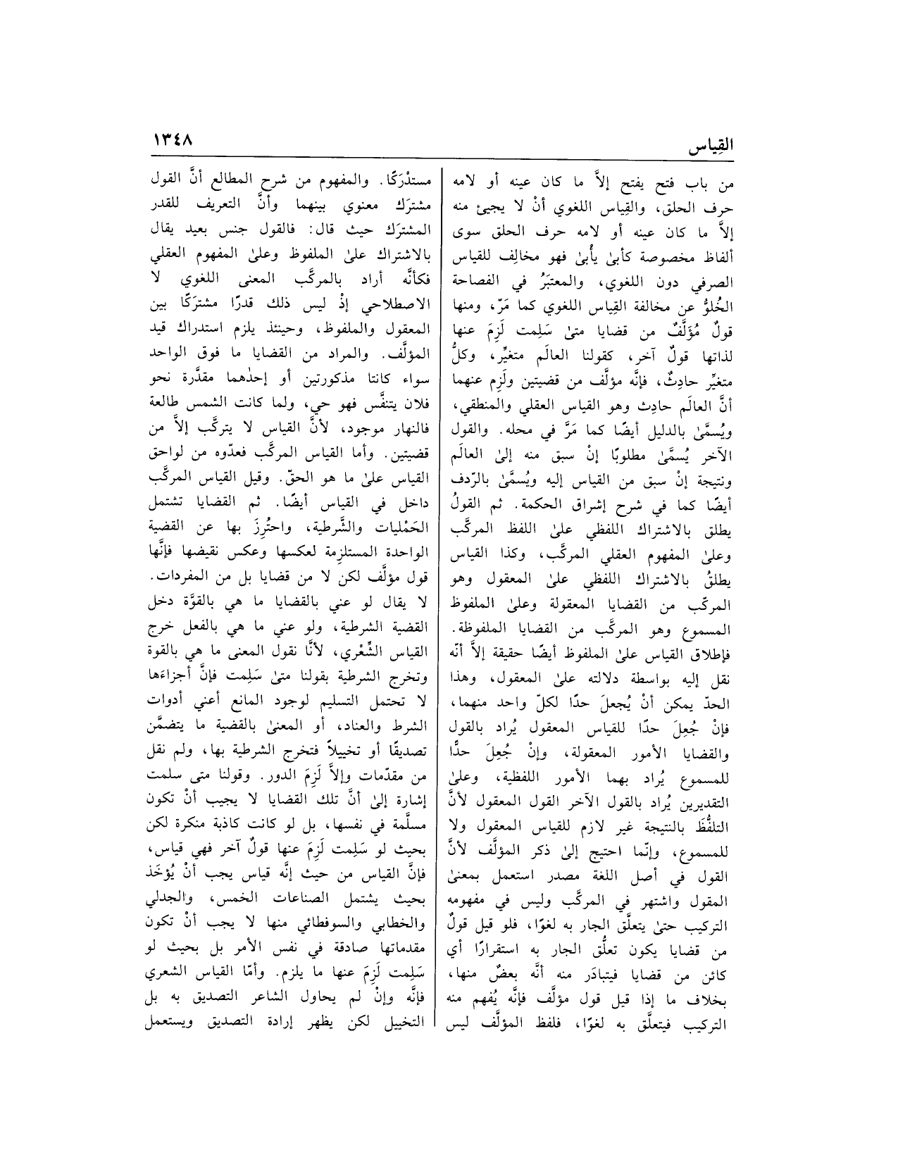 من باب فتح يفتح إلّا ما كان عينه أو لامه حرف الحلق، والقياس اللغوي أن لا يجيء منه إلّا ما كان عينه أو لامه حرف الحلق سوى ألفاظ مخصوصة كأبي يأبى فهو مخالف للقياس الصرفي دون اللغوي، والمعتبر في الفصاحة الخلوّ عن مخالفة القياس اللغوي كما مرّ، ومنها قول مؤلّف من قضايا متى سلمت لزم عنها لذاتها قول آخر، كقولنا العالم متغيّر، وكلّ متغيّر حادث، فإنّه مؤلّف من قضيتين ولزم عنهما أنّ العالم حادث وهو القياس العقلي والمنطقي، ويسمّى بالدليل أيضا كما مرّ في محله. والقول الآخر يسمّى مطلوبا إن سبق منه إلى العالم ونتيجة إن سبق من القياس إليه ويسمّى بالرّدف أيضا كما في شرح إشراق الحكمة. ثم القول يطلق بالاشتراك اللفظي على اللفظ المركّب وعلى المفهوم العقلي المركّب، وكذا القياس يطلق بالاشتراك اللفظي على المعقول وهو المركّب من القضايا المعقولة وعلى الملفوظ المسموع وهو المركّب من القضايا الملفوظة.