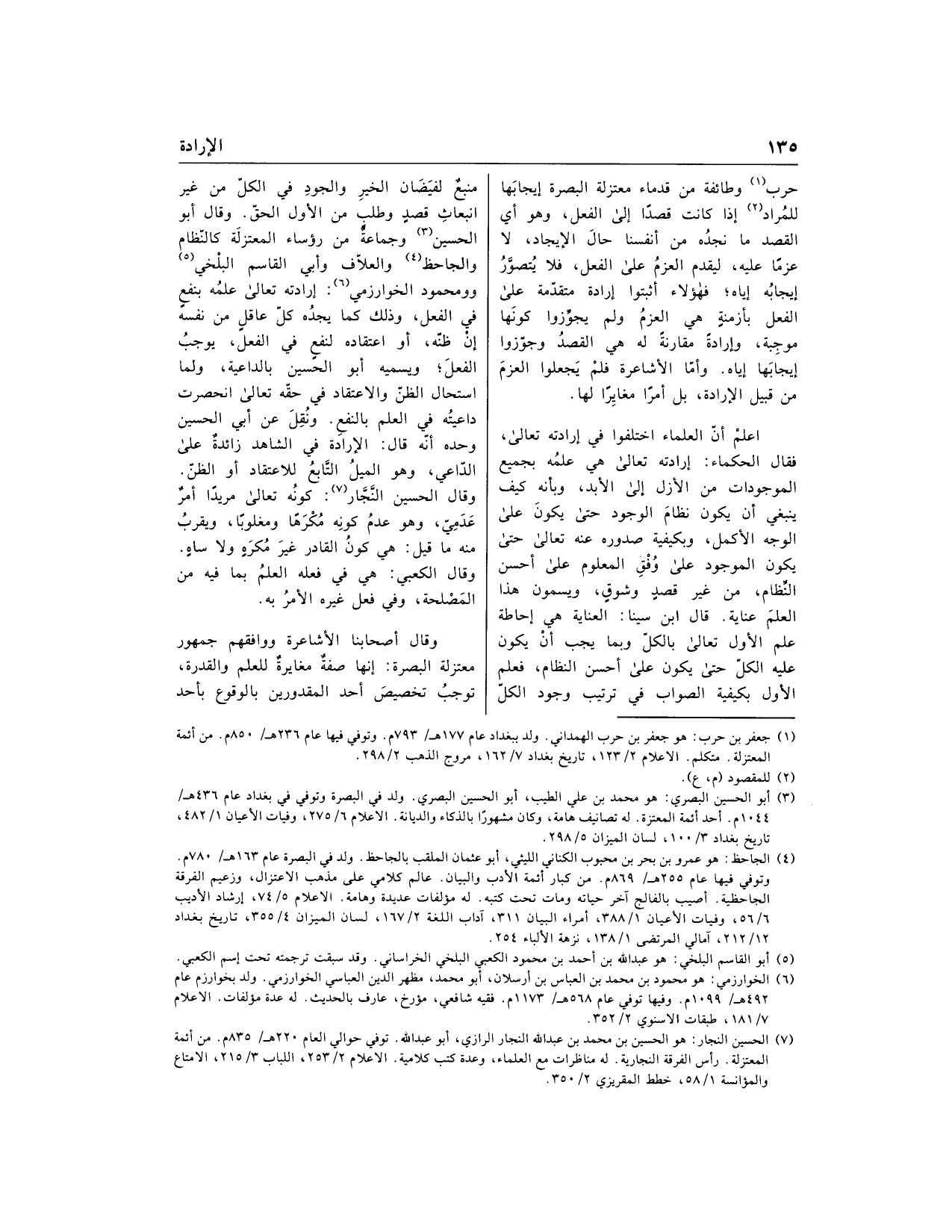 (1) جعفر بن حرب: هو جعفر بن حرب الهمداني. ولد ببغداد عام 177 هـ/ 793 م. وتوفي فيها عام 236 هـ/ 850 م. من أئمة المعتزلة. متكلم. الاعلام 2/ 123، تاريخ بغداد 7/ 162، مروج الذهب 2/ 298.