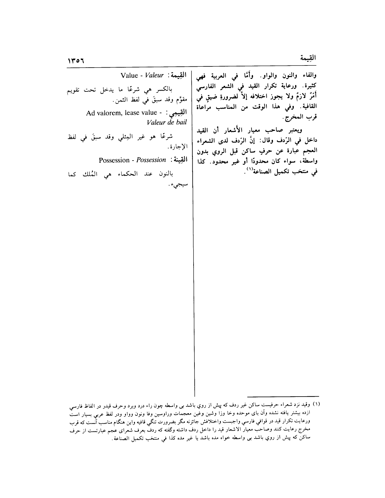 والفاء والنون والواو. وأمّا في العربية فهي كثيرة. ورعاية تكرار القيد في الشعر الفارسي أمر لازم ولا يجوز اختلافه إلّا لضرورة ضيق في القافية. وفي هذا الوقت من المناسب مراعاة قرب المخرج.