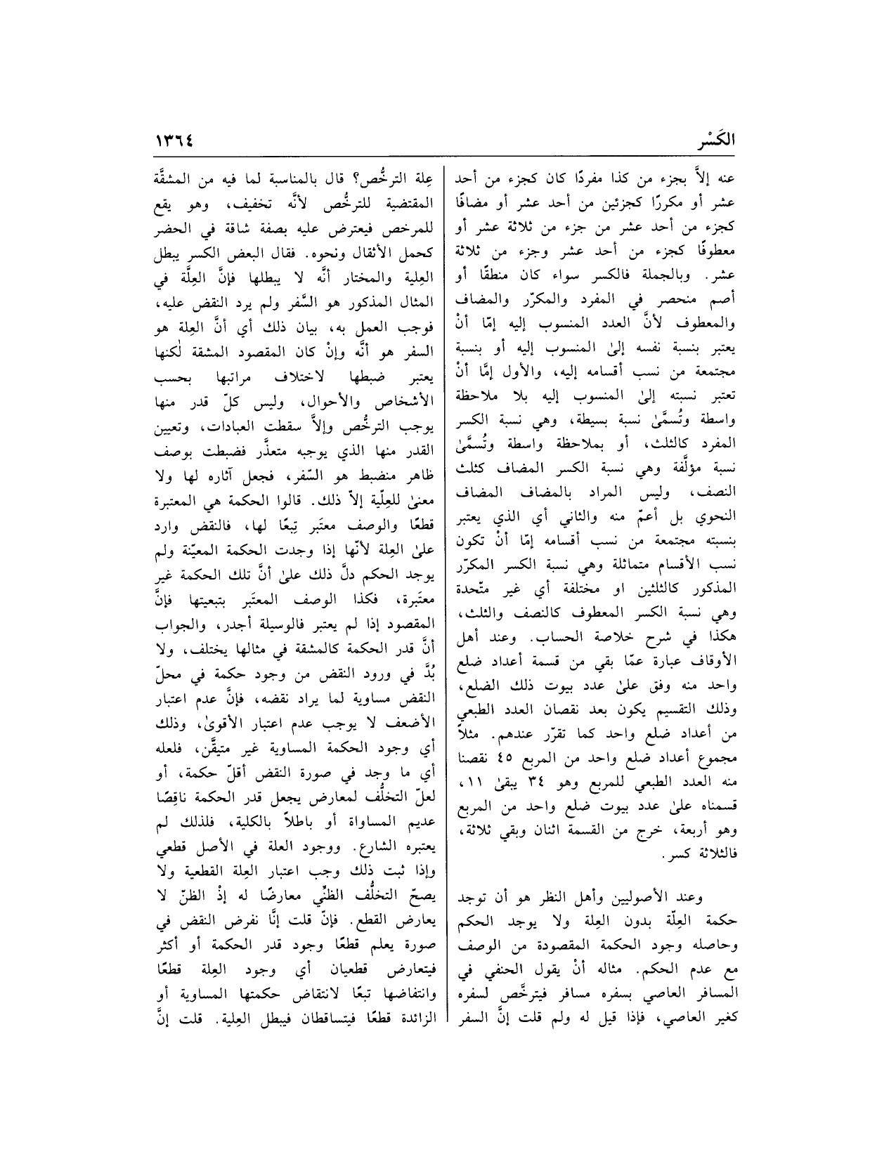 عنه إلّا بجزء من كذا مفردا كان كجزء من أحد عشر أو مكررا كجزءين من أحد عشر أو مضافا كجزء من أحد عشر من جزء من ثلاثة عشر أو معطوفا كجزء من أحد عشر وجزء من ثلاثة عشر. وبالجملة فالكسر سواء كان منطقا أو أصم منحصر في المفرد والمكرّر والمضاف والمعطوف لأنّ العدد المنسوب إليه إمّا أن يعتبر بنسبة نفسه إلى المنسوب إليه أو بنسبة مجتمعة من نسب أقسامه إليه، والأول إمّا أن تعتبر نسبته إلى المنسوب إليه بلا ملاحظة واسطة وتسمّى نسبة بسيطة، وهي نسبة الكسر المفرد كالثلث، أو بملاحظة واسطة وتسمّى نسبة مؤلّفة وهي نسبة الكسر المضاف كثلث النصف، وليس المراد بالمضاف المضاف النحوي بل أعمّ منه والثاني أي الذي يعتبر بنسبته مجتمعة من نسب أقسامه إمّا أن تكون نسب الأقسام متماثلة وهي نسبة الكسر المكرّر المذكور كالثلثين او مختلفة أي غير متّحدة وهي نسبة الكسر المعطوف كالنصف والثلث، هكذا في شرح خلاصة الحساب. وعند أهل الأوقاف عبارة عمّا بقي من قسمة أعداد ضلع واحد منه وفق على عدد بيوت ذلك الضلع، وذلك التقسيم يكون بعد نقصان العدد الطبعي من أعداد ضلع واحد كما تقرّر عندهم. مثلا مجموع أعداد ضلع واحد من المربع 45 نقصنا منه العدد الطبعي للمربع وهو 34 يبقى 11، قسمناه على عدد بيوت ضلع واحد من المربع وهو أربعة، خرج من القسمة اثنان وبقي ثلاثة، فالثلاثة كسر.