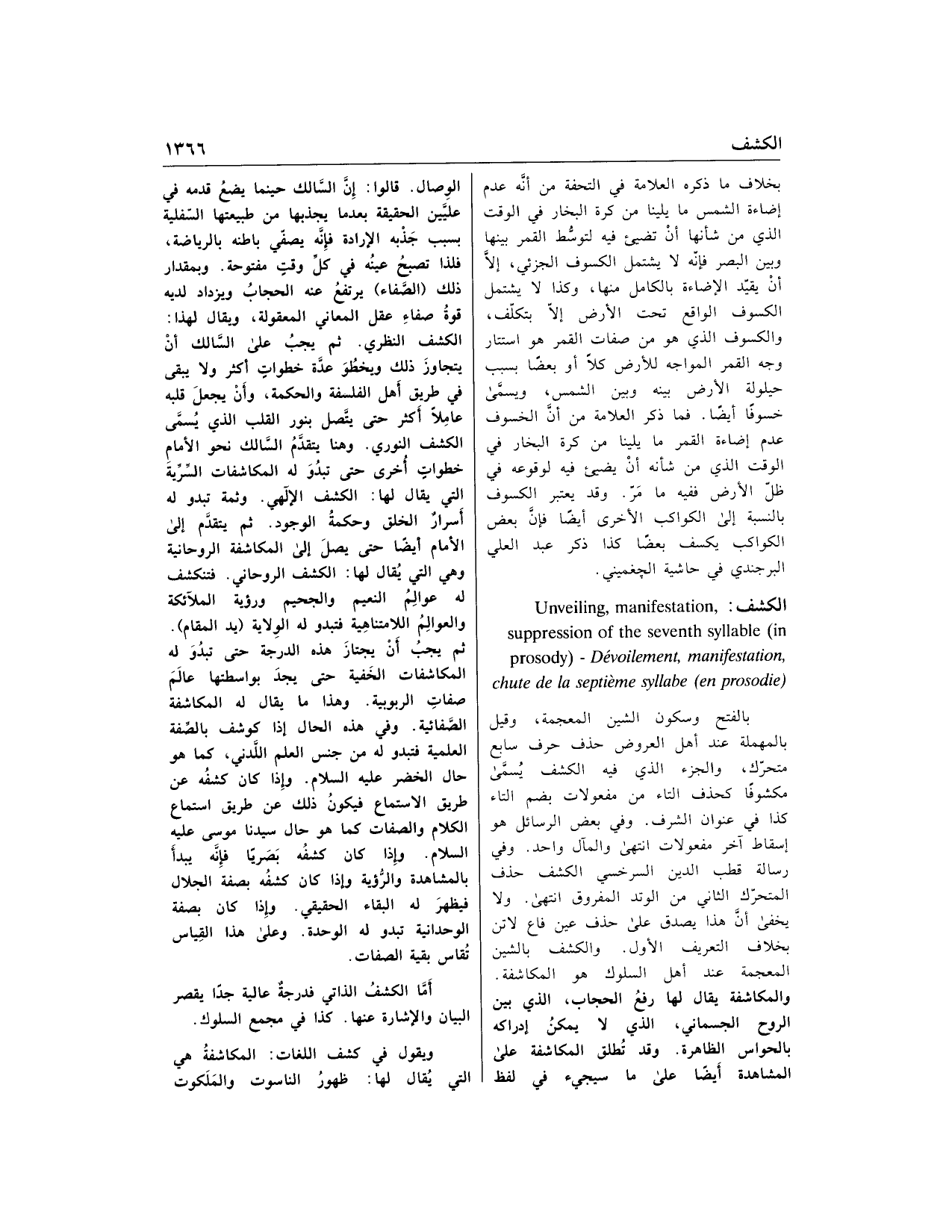 بالفتح وسكون الشين المعجمة، وقيل بالمهملة عند أهل العروض حذف حرف سابع متحرّك، والجزء الذي فيه الكشف يسمّى مكشوفا كحذف التاء من مفعولات بضم التاء كذا في عنوان الشرف. وفي بعض الرسائل هو إسقاط آخر مفعولات انتهى والمآل واحد. وفي رسالة قطب الدين السرخسي الكشف حذف المتحرّك الثاني من الوتد المفروق انتهى. ولا يخفى أنّ هذا يصدق على حذف عين فاع لاتن بخلاف التعريف الأول. والكشف بالشين المعجمة عند أهل السلوك هو المكاشفة.