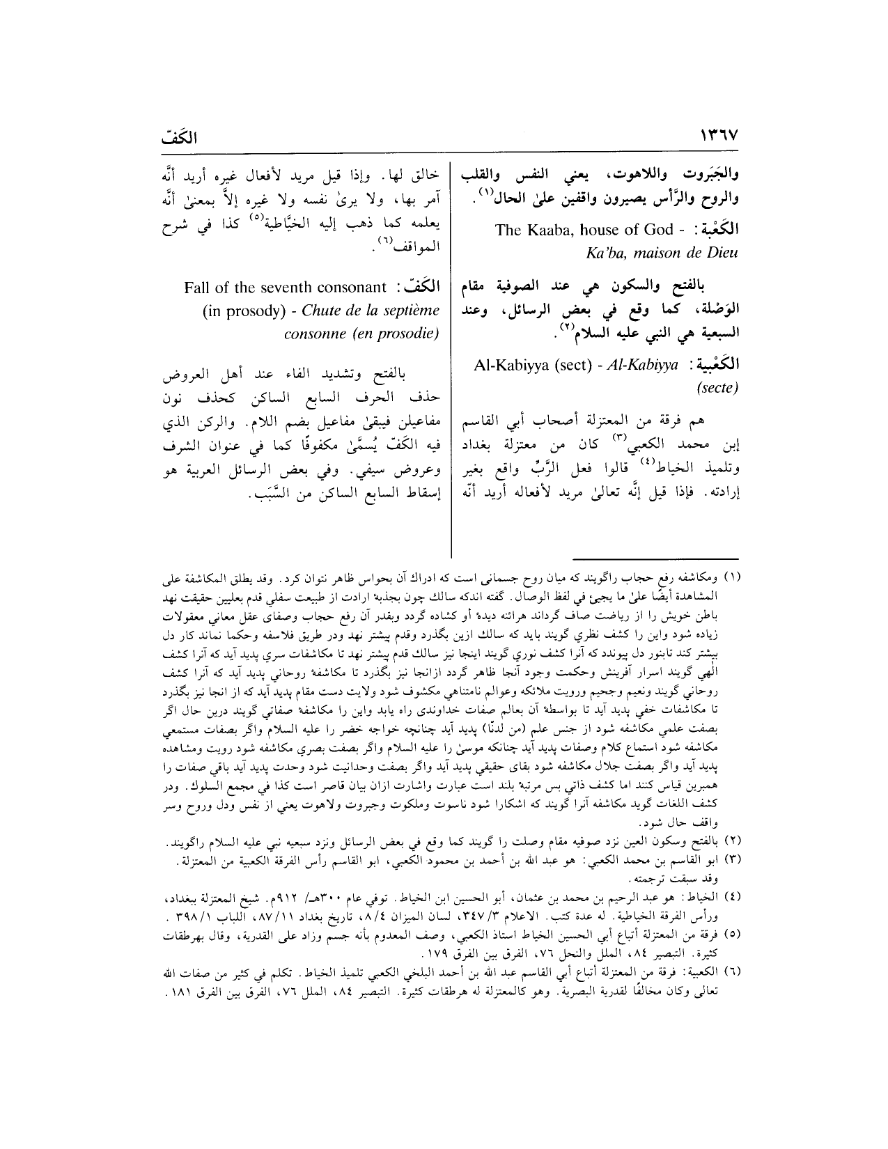 (6) الكعبية: فرقة من المعتزلة أتباع أبي القاسم عبد الله بن أحمد البلخي الكعبي تلميذ الخياط. تكلم في كثير من صفات الله تعالى وكان مخالفا لقدرية البصرية. وهو كالمعتزلة له هرطقات كثيرة. التبصير 84، الملل 76، الفرق بين الفرق 181.