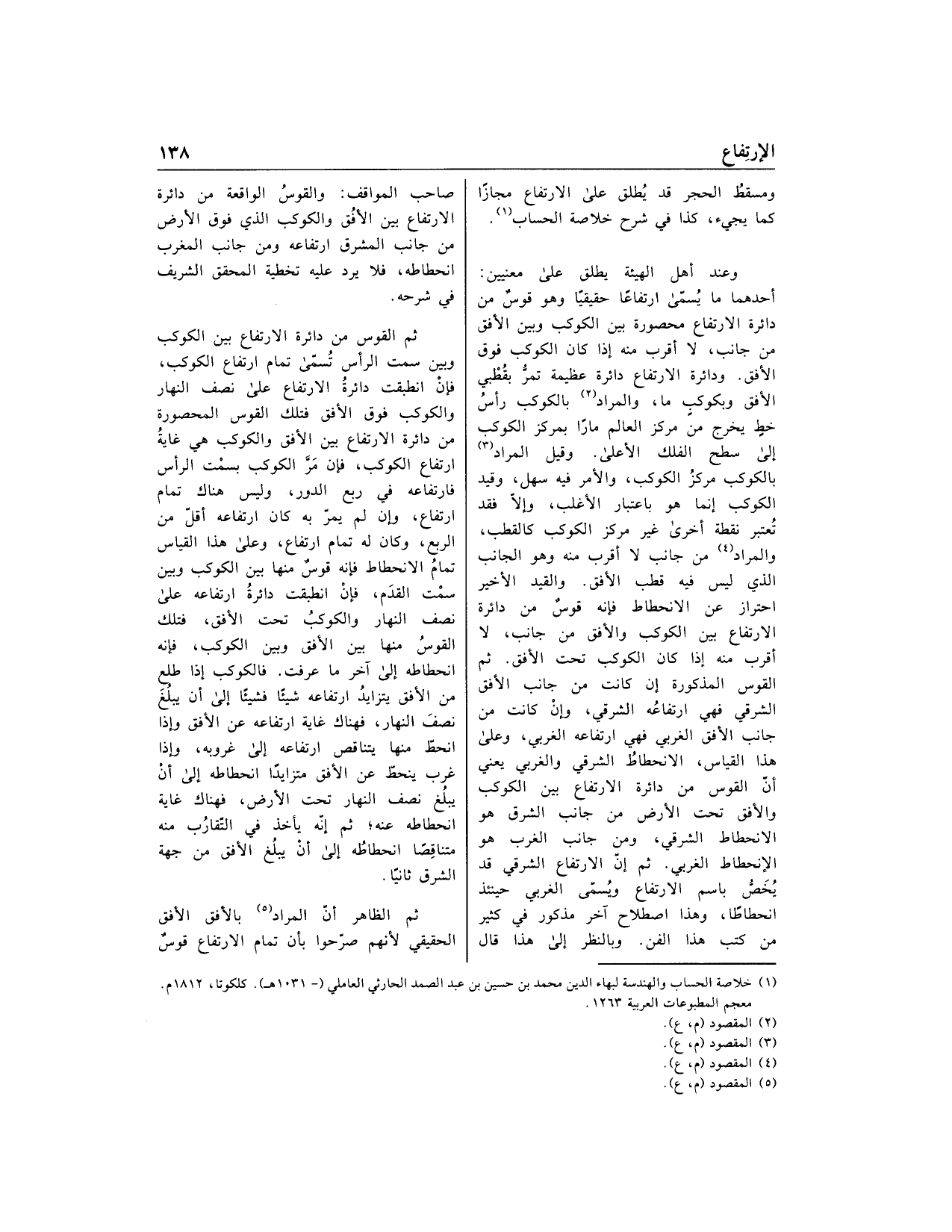 أحدهما ما يسمّى ارتفاعا حقيقيا وهو قوس من دائرة الارتفاع محصورة بين الكوكب وبين الأفق من جانب، لا أقرب منه إذا كان الكوكب فوق الأفق. ودائرة الارتفاع دائرة عظيمة تمرّ بقطبي الأفق وبكوكب ما، والمراد «2» بالكوكب رأس خط يخرج من مركز العالم مارا بمركز الكوكب إلى سطح الفلك الأعلى. وقيل المراد «3» بالكوكب مركز الكوكب، والأمر فيه سهل، وقيد الكوكب إنما هو باعتبار الأغلب، وإلّا فقد تعتبر نقطة أخرى غير مركز الكوكب كالقطب، والمراد «4» من جانب لا أقرب منه وهو الجانب الذي ليس فيه قطب الأفق. والقيد الأخير احتراز عن الانحطاط فإنه قوس من دائرة الارتفاع بين الكوكب والأفق من جانب، لا أقرب منه إذا كان الكوكب تحت الأفق. ثم القوس المذكورة إن كانت من جانب الأفق الشرقي فهي ارتفاعه الشرقي، وإن كانت من جانب الأفق الغربي فهي ارتفاعه الغربي، وعلى هذا القياس، الانحطاط الشرقي والغربي يعني أنّ القوس من دائرة الارتفاع بين الكوكب والأفق تحت الأرض من جانب الشرق هو الانحطاط الشرقي، ومن جانب الغرب هو الانحطاط الغربي. ثم إنّ الارتفاع الشرقي قد يخصّ باسم الارتفاع ويسمّى الغربي حينئذ انحطاطا، وهذا اصطلاح آخر مذكور في كثير من كتب هذا الفن. وبالنظر إلى هذا قال صاحب المواقف: والقوس الواقعة من دائرة الارتفاع بين الأفق والكوكب الذي فوق الأرض من جانب المشرق ارتفاعه ومن جانب المغرب انحطاطه، فلا يرد عليه تخطئة المحقق الشريف في شرحه.