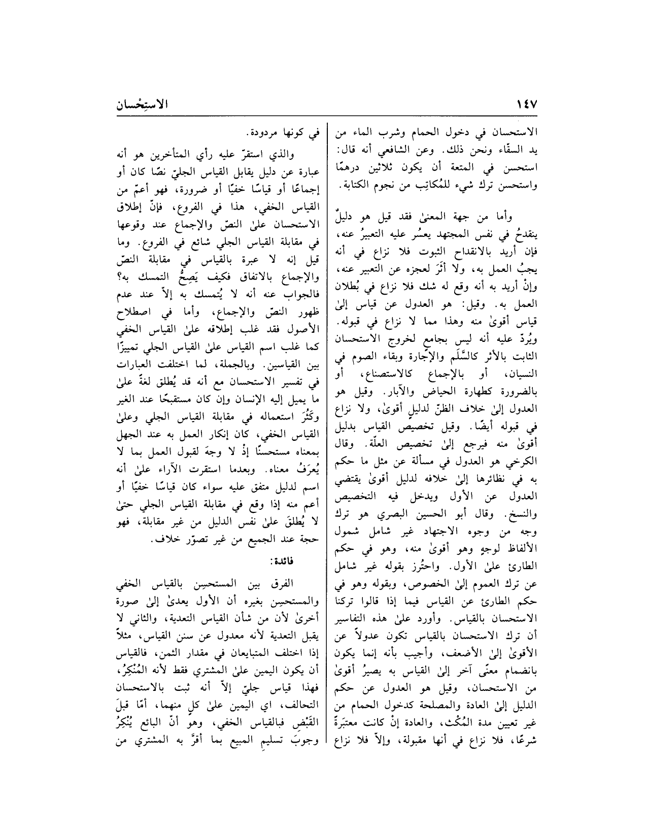 ويردّ عليه أنه ليس بجامع لخروج الاستحسان الثابت بالأثر كالسّلم والإجارة وبقاء الصوم في النسيان، أو بالإجماع كالاستصناع، أو بالضرورة كطهارة الحياض والآبار. وقيل هو العدول إلى خلاف الظنّ لدليل أقوى. ولا نزاع في قبوله أيضا. وقيل تخصيص القياس بدليل أقوى منه فيرجع إلى تخصيص العلّة. وقال الكرخي هو العدول في مسألة عن مثل ما حكم به في نظائرها إلى خلافه لدليل أقوى يقتضي العدول عن الأول ويدخل فيه التخصيص والنسخ. وقال أبو الحسين البصري هو ترك وجه من وجوه الاجتهاد غير شامل شمول الألفاظ لوجه وهو أقوى منه، وهو في حكم الطارئ على الأول. واحترز بقوله غير شامل عن ترك العموم إلى الخصوص، وبقوله وهو في حكم الطارئ عن القياس فيما إذا قالوا تركنا الاستحسان بالقياس. وأورد على هذه التفاسير أن ترك الاستحسان بالقياس تكون عدولا عن الأقوى إلى الأضعف، وأجيب بأنه إنما يكون بانضمام معنى آخر إلى القياس به يصير أقوى من الاستحسان، وقيل هو العدول عن حكم الدليل إلى العادة والمصلحة كدخول الحمام من غير تعيين مدة المكث، والعادة إن كانت معتبرة شرعا، فلا نزاع في أنها مقبولة، وإلّا فلا نزاع في كونها مردودة.
