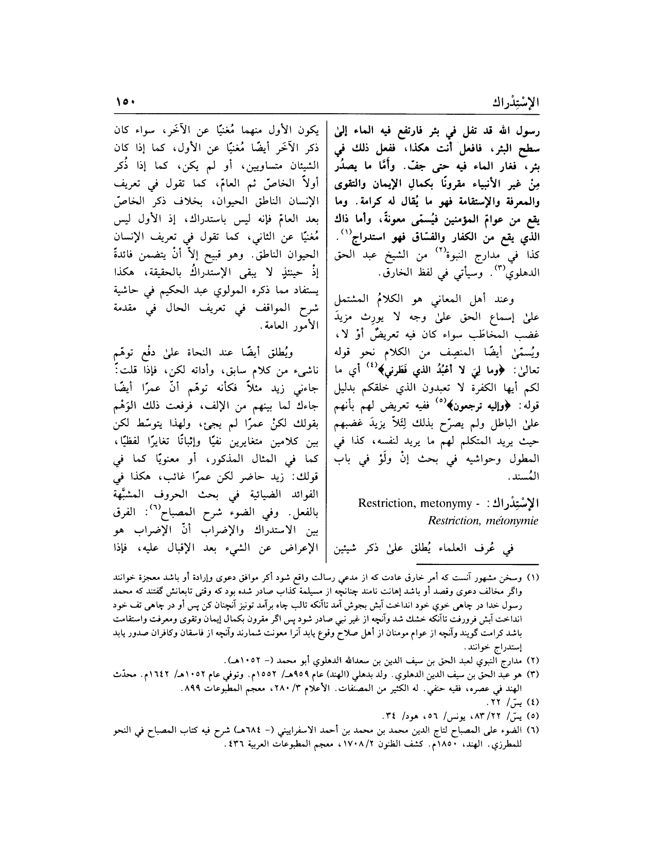 في عرف العلماء يطلق على ذكر شيئين يكون الأول منهما مغنيا عن الآخر، سواء كان ذكر الآخر أيضا مغنيا عن الأول، كما إذا كان الشيئان متساويين، أو لم يكن، كما إذا ذكر أولا الخاصّ ثم العامّ، كما تقول في تعريف الإنسان الناطق الحيوان، بخلاف ذكر الخاصّ بعد العامّ فإنه ليس باستدراك، إذ الأول ليس مغنيا عن الثاني، كما تقول في تعريف الإنسان الحيوان الناطق. وهو قبيح إلّا أن يتضمن فائدة إذ حينئذ لا يبقى الاستدراك بالحقيقة، هكذا يستفاد مما ذكره المولوي عبد الحكيم في حاشية شرح المواقف في تعريف الحال في مقدمة الأمور العامة.