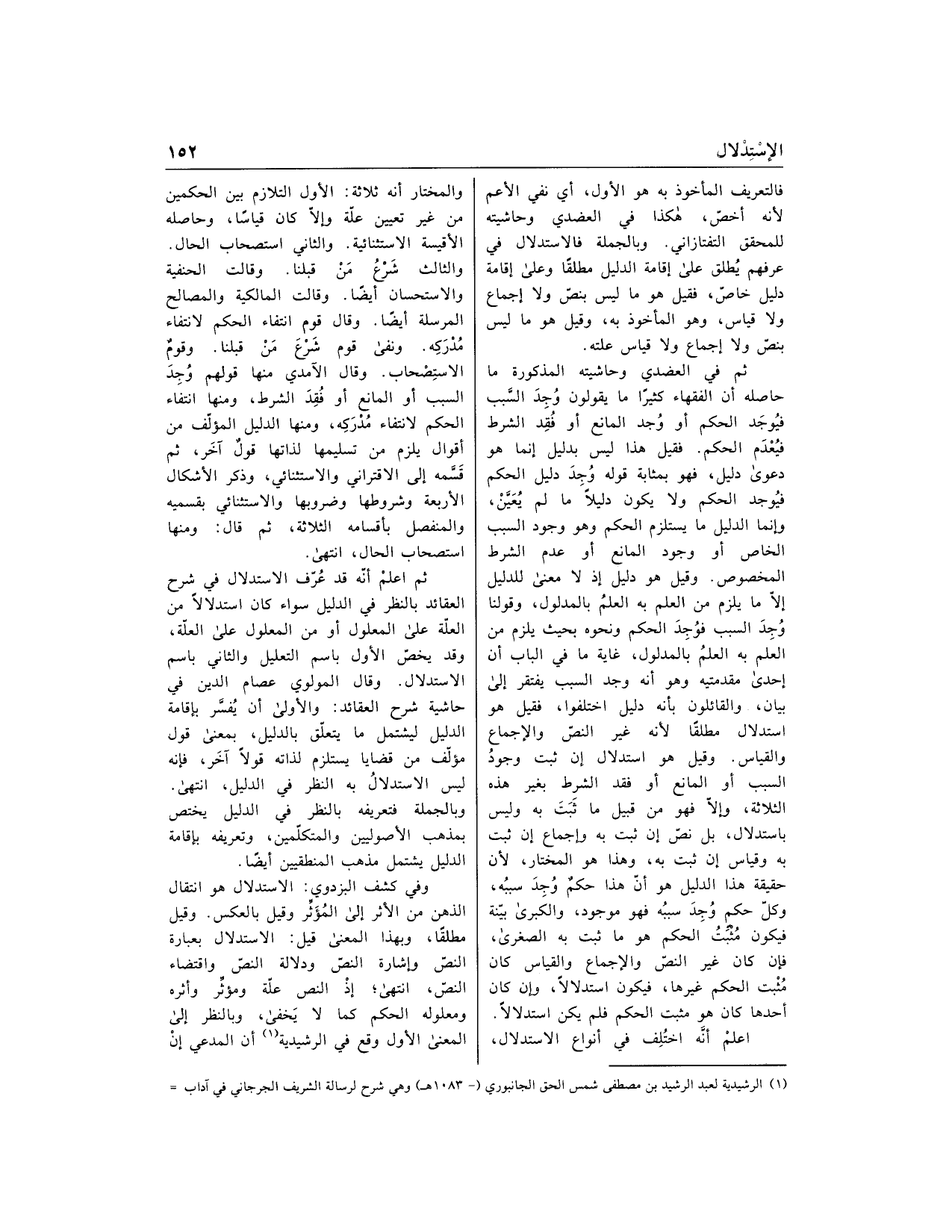 فالتعريف المأخوذ به هو الأول، أي نفي الأعم لأنه أخصّ، هكذا في العضدي وحاشيته للمحقق التفتازاني. وبالجملة فالاستدلال في عرفهم يطلق على إقامة الدليل مطلقا وعلى إقامة دليل خاصّ، فقيل هو ما ليس بنصّ ولا إجماع ولا قياس، وهو المأخوذ به، وقيل هو ما ليس بنصّ ولا إجماع ولا قياس علته.