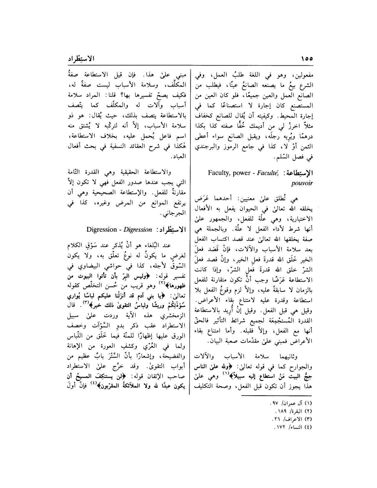 وثانيهما سلامة الأسباب والآلات والجوارح كما في قوله تعالى: وَلِلَّهِ عَلَى النَّاسِ حِجُّ الْبَيْتِ مَنِ اسْتَطاعَ إِلَيْهِ سَبِيلًا «1» وهي على هذا يجوز أن تكون قبل الفعل، وصحة التكليف مبني على هذا. فإن قيل الاستطاعة صفة المكلّف، وسلامة الأسباب ليست صفة له، فكيف يصحّ تفسيرها بها؟ قلنا: المراد سلامة أسباب وآلات له والمكلّف كما يتّصف بالاستطاعة يتصف بذلك، حيث يقال: هو ذو سلامة الأسباب، إلّا أنه لتركّبه لا يشتق منه اسم فاعل يحمل عليه، بخلاف الاستطاعة، هكذا في شرح العقائد النسفية في بحث أفعال العباد.