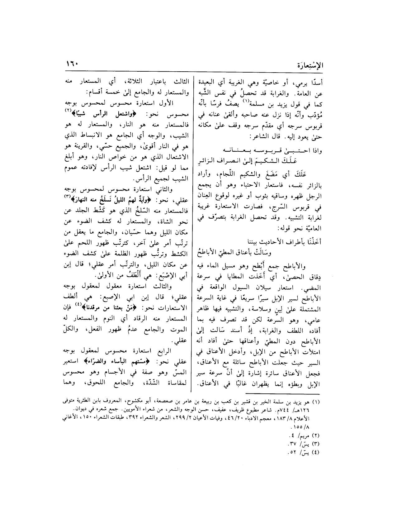 والثاني استعارة محسوس لمحسوس بوجه عقلي، نحو: وَآيَةٌ لَهُمُ اللَّيْلُ نَسْلَخُ مِنْهُ النَّهارَ «3» فالمستعار منه السّلخ الذي هو كشط الجلد عن نحو الشاة، والمستعار له كشف الضوء عن مكان الليل وهما حسّيان، والجامع ما يعقل من ترتّب أمر على آخر، كترتّب ظهور اللحم على الكسط وترتّب ظهور الظلمة على كشف الضوء عن مكان الليل، والترتّب أمر عقلي؛ قال ابن أبي الإصبع: هي ألطف من الأولى.