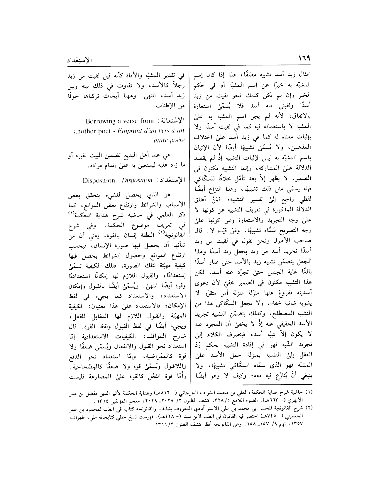 (1) حاشية شرح هداية الحكمة، لعلي بن محمد الشريف الجرجاني (- 816 هـ) وهداية الحكمة لأثير الدين مفضل بن عمر الأبهري (- 663 هـ). الضوء اللامع 5/ 328، كشف الظنون 2/ 2028 - 2029، معجم المؤلفين 4/ 63.