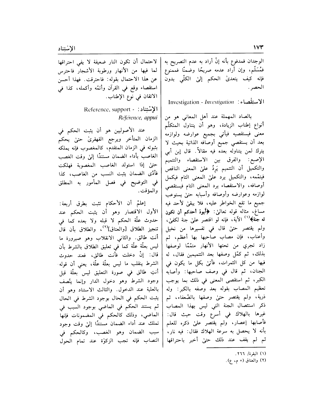 بالصاد المهملة عند أهل المعاني هو من أنواع إطناب الزيادة، وهو أن يتناول المتكلّم معنى فيستقصيه فيأتي بجميع عوارضه ولوازمه بعد أن يستقصي جميع أوصافه الذاتية بحيث لا يترك لمن يتناوله بعده فيه مقالا. قال ابن أبي الإصبع: والفرق بين الاستقصاء والتتميم والتكميل أن التتميم يرد على المعنى الناقص فيتمّمه، والتكميل يرد على المعنى التام فيكمل أوصافه، والاستقصاء يرد المعنى التام فيستقصي لوازمه وعوارضه وأوصافه وأسبابه حتى يستوعب جميع ما تقع الخواطر عليه، فلا يبقى لأحد فيه مساغ، مثاله قوله تعالى: أَيَوَدُّ أَحَدُكُمْ أَنْ تَكُونَ لَهُ جَنَّةٌ «1» الآية، فإنه لو اقتصر على جنة لكفى، ولم يقتصر حتى قال في تفسيرها من نخيل وأعناب، فإن مصاب صاحبها بها أعظم، ثم زاد تجري من تحتها الأنهار متمّما لوصفها بذلك، ثم كمّل وصفها بعد التتميمين فقال، له فيها من كل الثمرات، فأتى بكل ما يكون في الجنان، ثم قال في وصف صاحبها: وأصابه الكبر، ثم استقصى المعنى في ذلك بما يوجب تعظيم المصاب بقوله بعد وصفه بالكبر: وله ذرية، ولم يقتصر حتى وصفها بالضّعفاء، ثم ذكر استئصال الجنة التي ليس بهذا المصاب غيرها بالهلاك في أسرع وقت حيث قال: