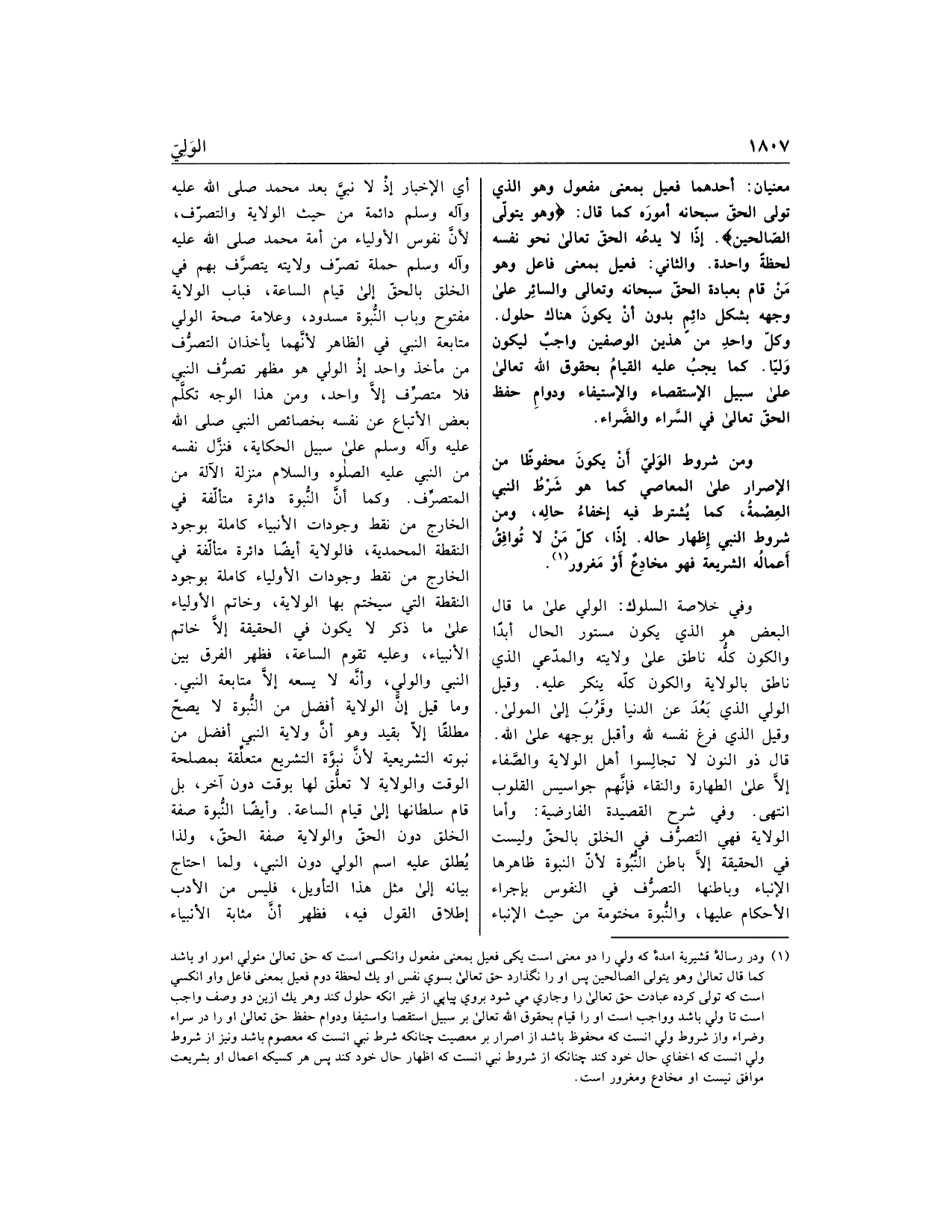 (1) ودر رساله قشيرية امده كه ولي را دو معنى است يكى فعيل بمعنى مفعول وآن كسى است كه حق تعالى متولي امور او باشد كما قال تعالى وهو يتولى الصالحين پس او را نگذارد حق تعالى به سوى نفس او يك لحظة دوم فعيل بمعنى فاعل واو آن كسي است كه تولى كرده عبادت حق تعالى را وجاري مى شود بروي پياپى از غير آنكه حلول كند وهريك ازين دو وصف واجب است تا ولي باشد وواجب است او را قيام بحقوق الله تعالى بر سبيل استقصا واستيفا ودوام حفظ حق تعالى او را در سراء وضراء واز شروط ولي آنست كه محفوظ باشد از اصرار بر معصيت چنانكه شرط نبي آنست كه معصوم باشد ونيز از شروط ولي آنست كه اخفاي حال خود كند چنانكه از شروط نبي آنست كه اظهار حال خود كند پس هركسيكه اعمال او بشريعت موافق نيست او مخادع ومغرور است.